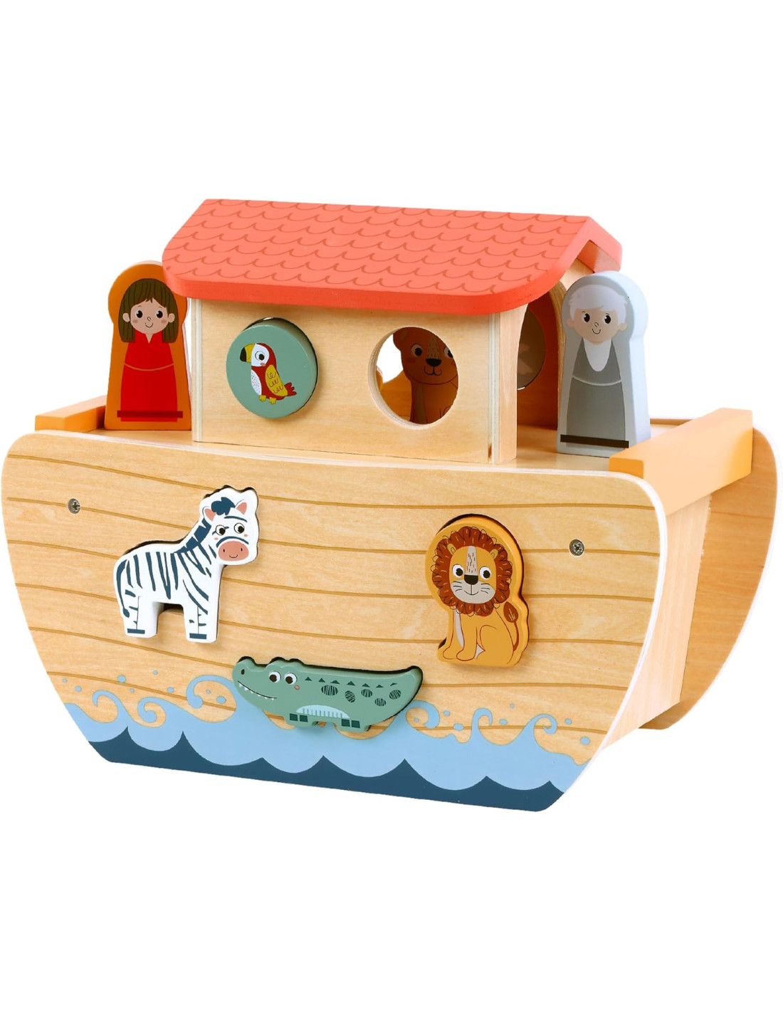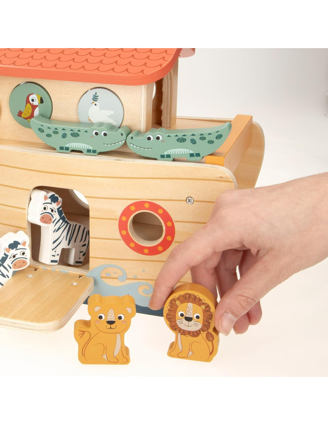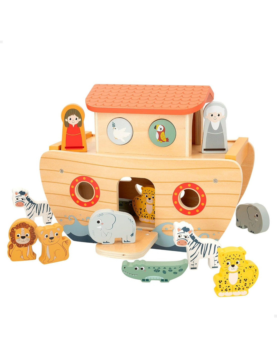 Incluye: Arca de Noé, 6 animales salvajes con impresión a doble cara (cebra, león, tigre, leopardo, cocodrilo y elefante), figura de Noé y figura esposa de Noé