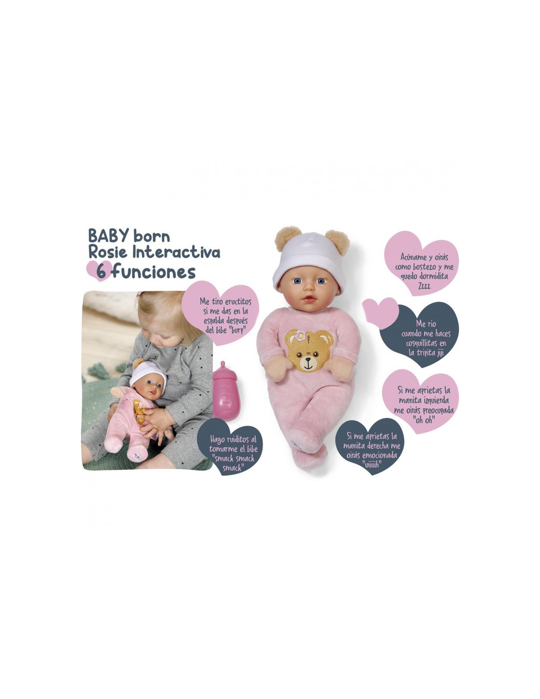 - Incluye un biberón para activar sonidos.