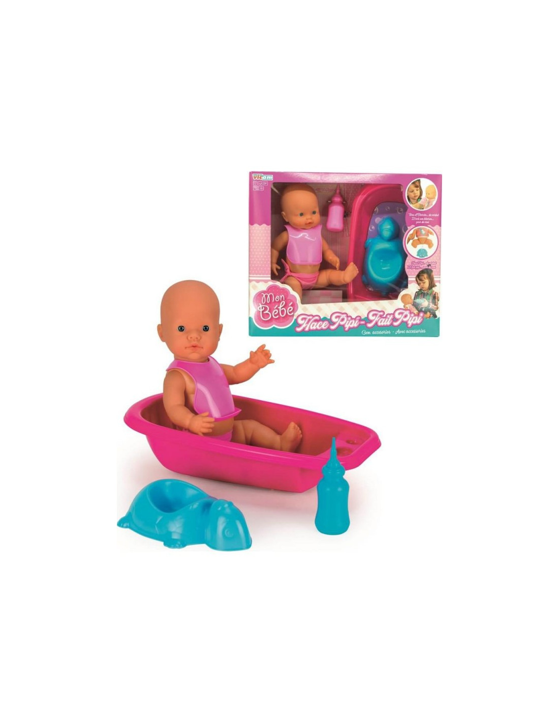 Precioso muñeco bebé, dale el biberón y hará pipi en su orinal. Cuenta con una bañera para que lo puedas lavar, orinal, biberón y babero.