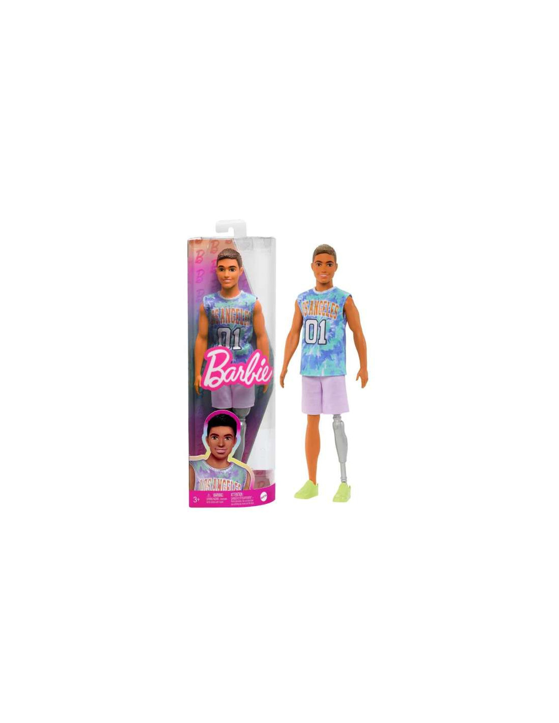 Este muñeco Ken tiene el pelo castaño y una pierna protésica. Lleva una camiseta con estampado tie-dye de Los Ángeles que hace que su personalidad destaque.