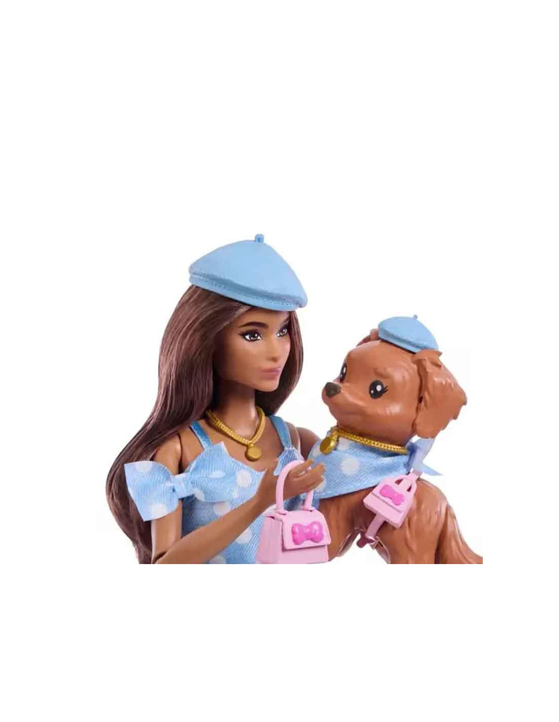 ¡La muñeca Barbie y su perrito van coordinados con adorables lunares azules!