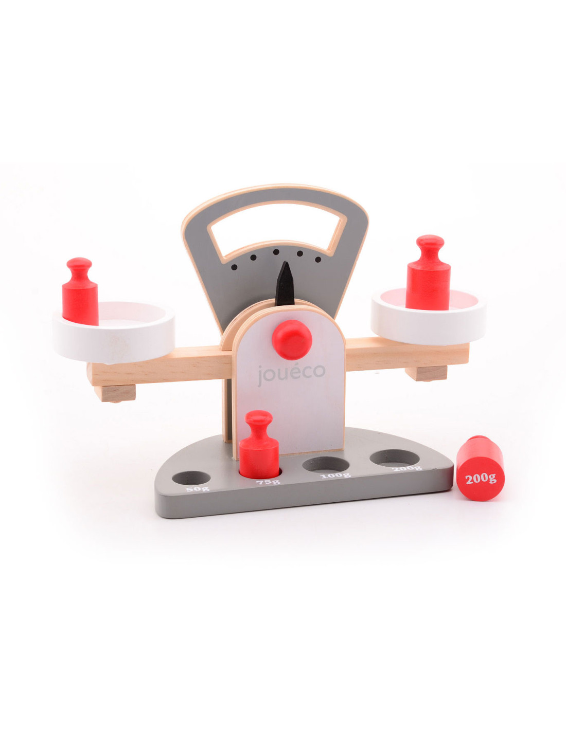 Aprende a mantener el equilibrio con esta báscula de madera. Coloca objetos como frutas en un lado y una de las pesas de colores en el otro. ¡De esta manera, podrás aprender cuánto pesa algo en poco tiempo! La báscula está hecha de madera resistente y tiene un acabado con hermosos detalles. Incluye 4 pesas.
