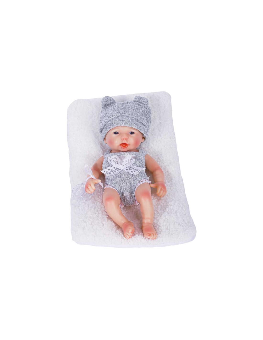 - Ropa adorable: El bebé viene vestido con un bonito conjunto de gorrito y ropa tejida, lo que añade aún más encanto y ternura al juguete.