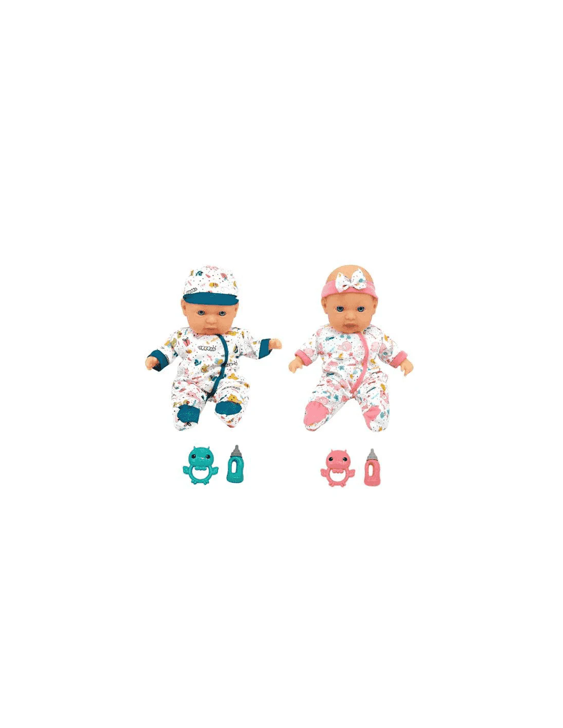 El set Bebés Gemelitos PequeBB incluye dos muñecos bebé de aspecto realista, con cuerpo rígido y expresión dulce. Cada uno viene con su propio biberón y mordedor, perfectos para recrear rutinas de alimentación y cuidado. Los gemelitos visten conjuntos suaves de algodón con estampados coloridos y gorritos a juego: uno en tonos azules y otro en tonos rosas. Su tamaño y peso son ideales para manos pequeñas, facilitando el juego libre y seguro.