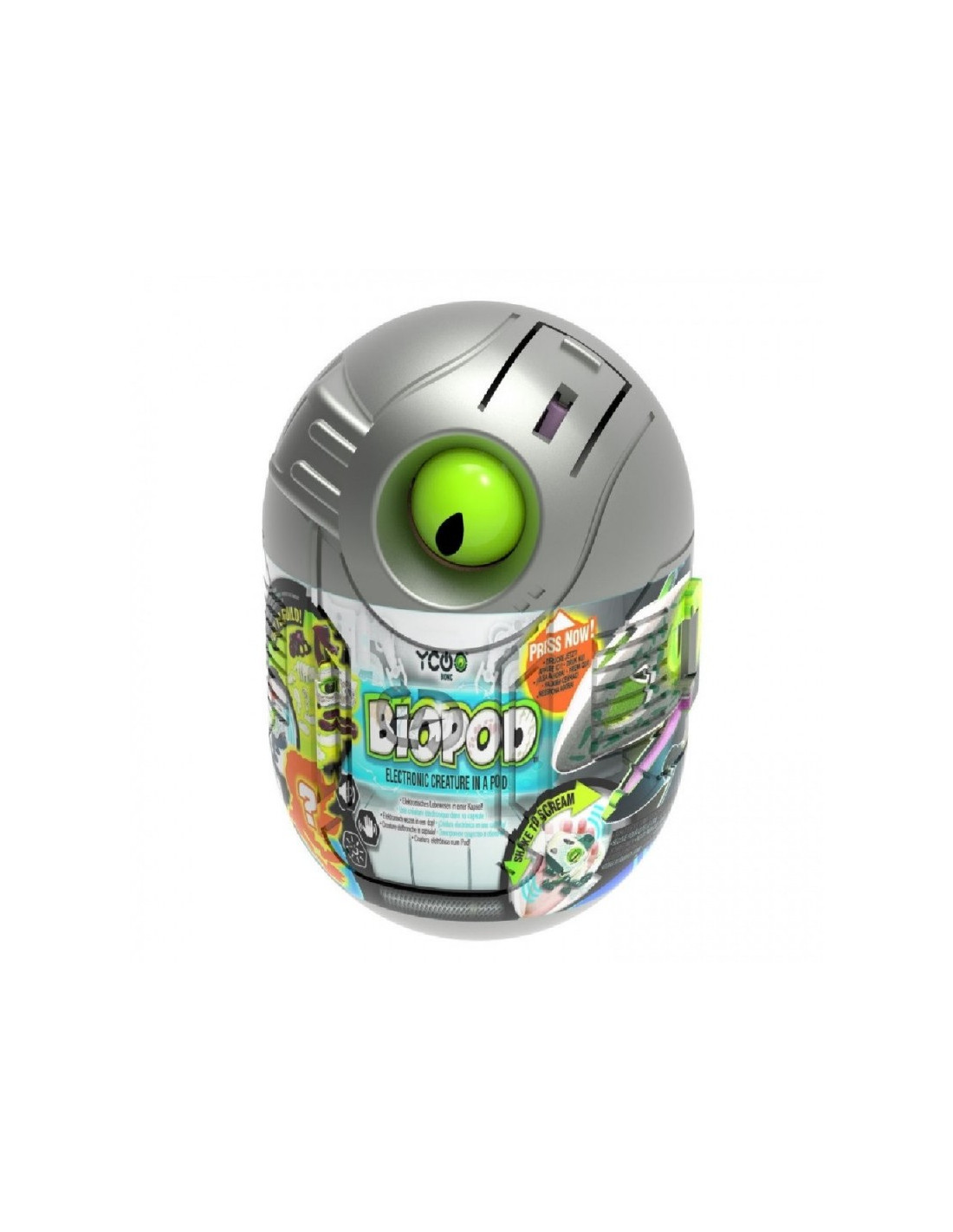 ¡Hay un Biosaurus totalmente vivo dentro del huevo! Abre el huevo y construye tu propia criatura electrónica. Presiona el botón de la cabeza y mira como mueve la mandíbula con luces y sonidos. ¡Mueve los ojos también, está vivo! Además al agitarlo emite diferentes sonidos. El huevo mide 9cm.