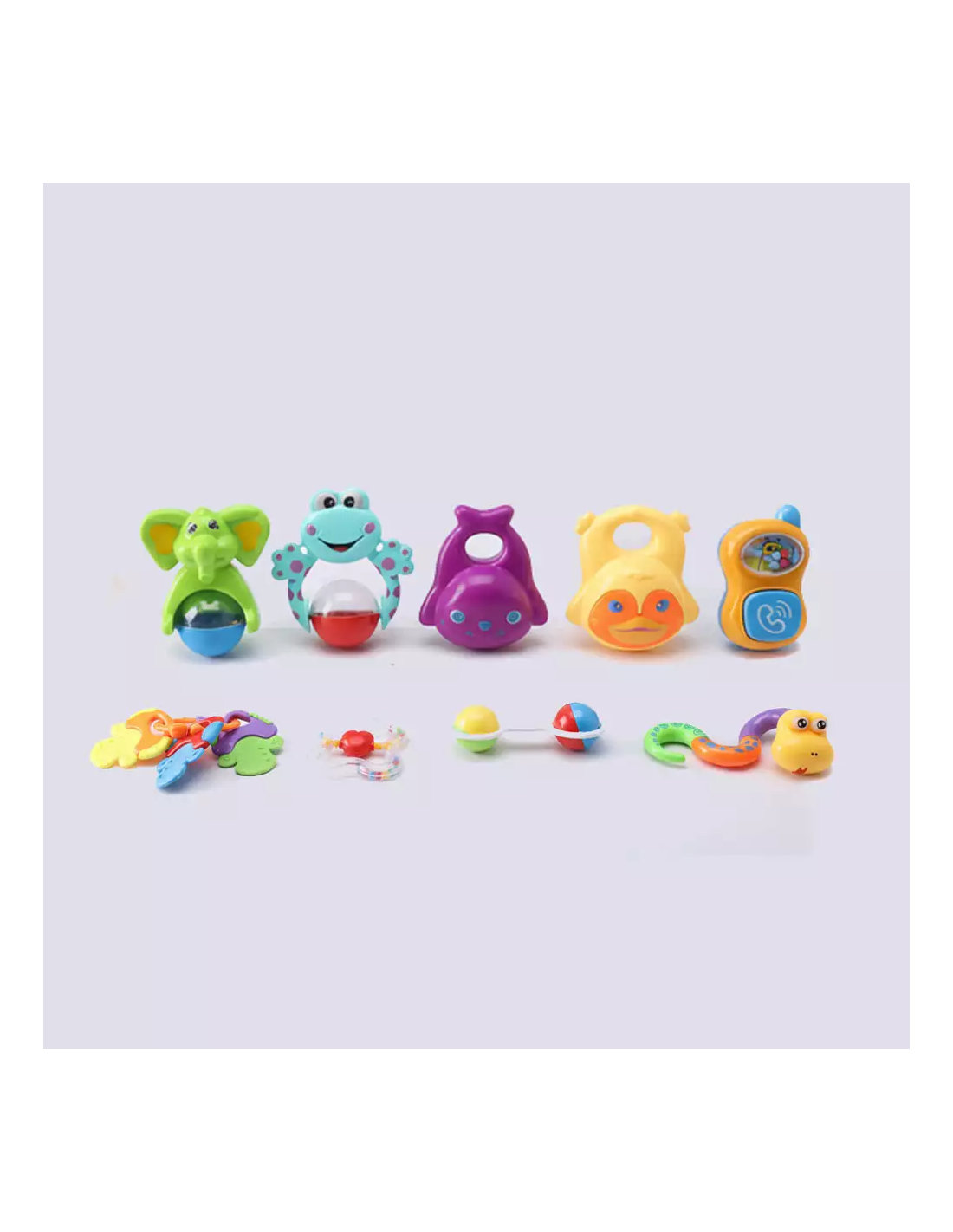 Porque es colorido, variado y completamente seguro. Cada pieza tiene una forma y una función distinta: hay sonajeros que giran, mordedores con texturas, formas de animalitos, anillos de agarre y piezas que suenan al agitar. Es un set pensado para entretener y estimular al bebé mientras descubre el mundo con las manos y la boca.