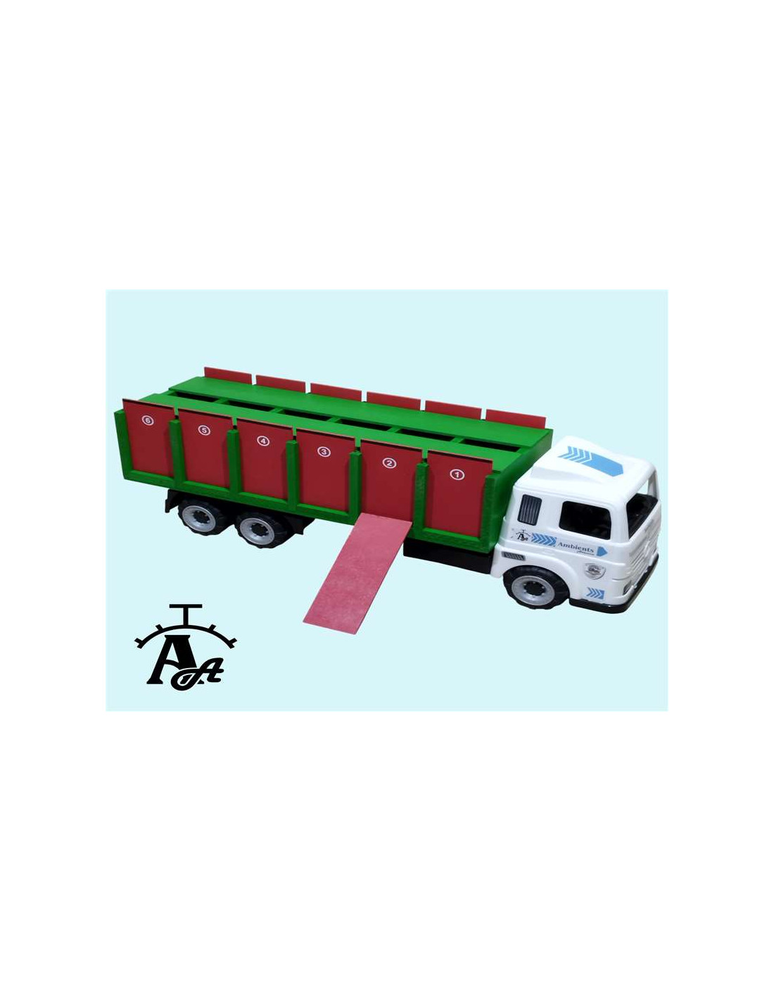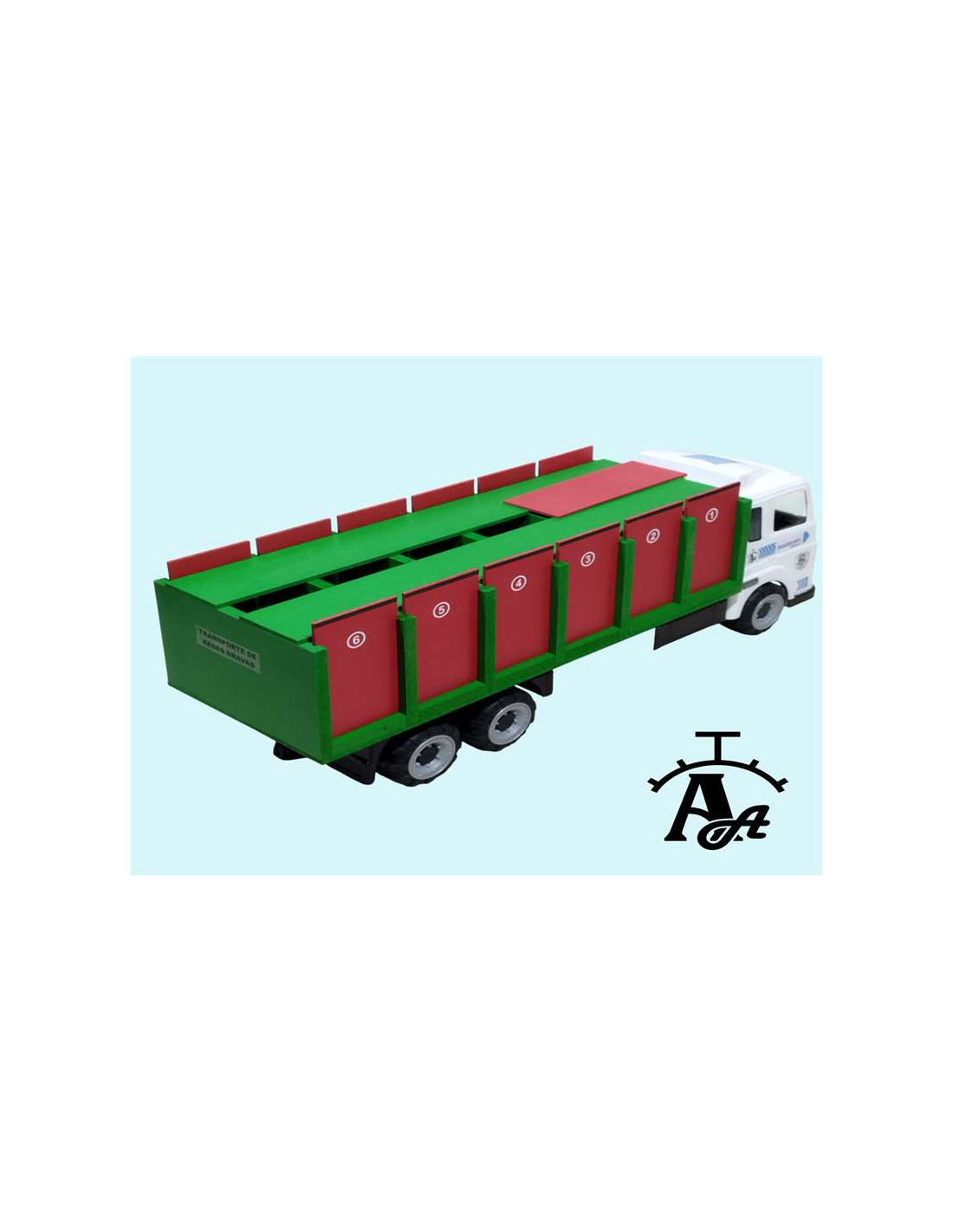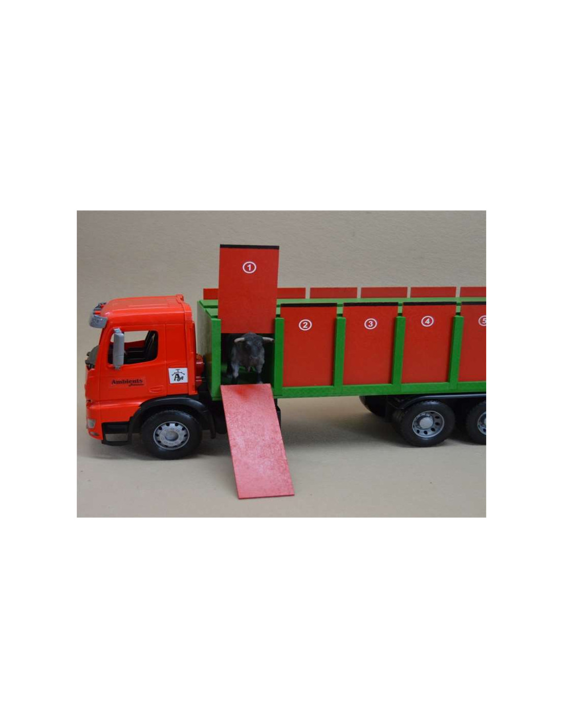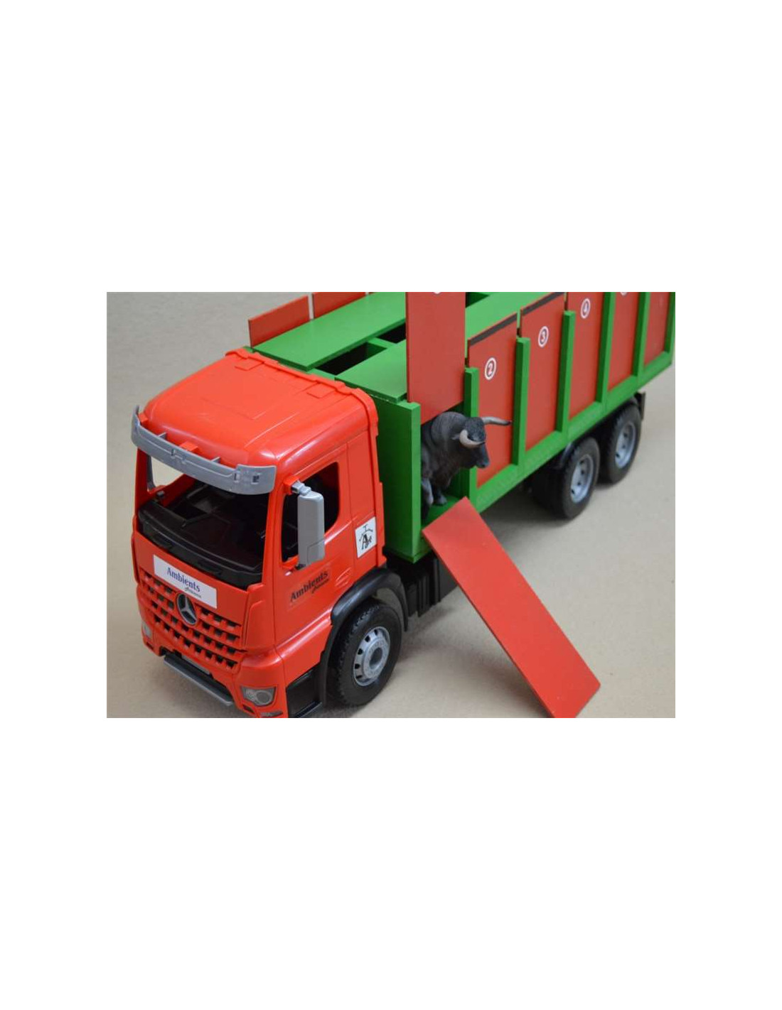 Este tipo de camión tiene una cabina de plástico, 6 ruedas, 1 cajón para toros grande en el que caben 6 animales, 12 puertas y 1 rampa. Medidas: 61 cm de largo x 18 cm de ancho x 21 cm de alto aproximadamente.