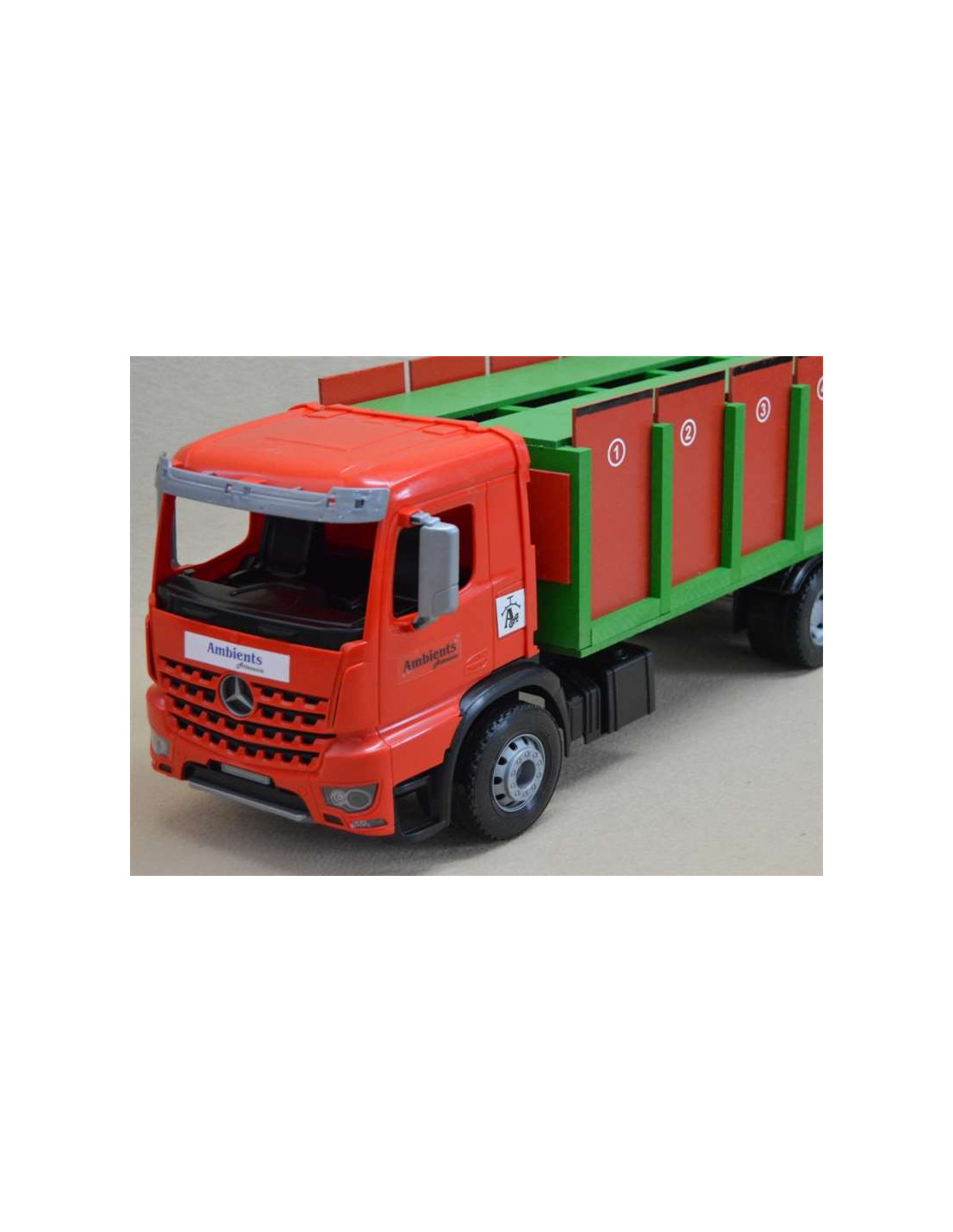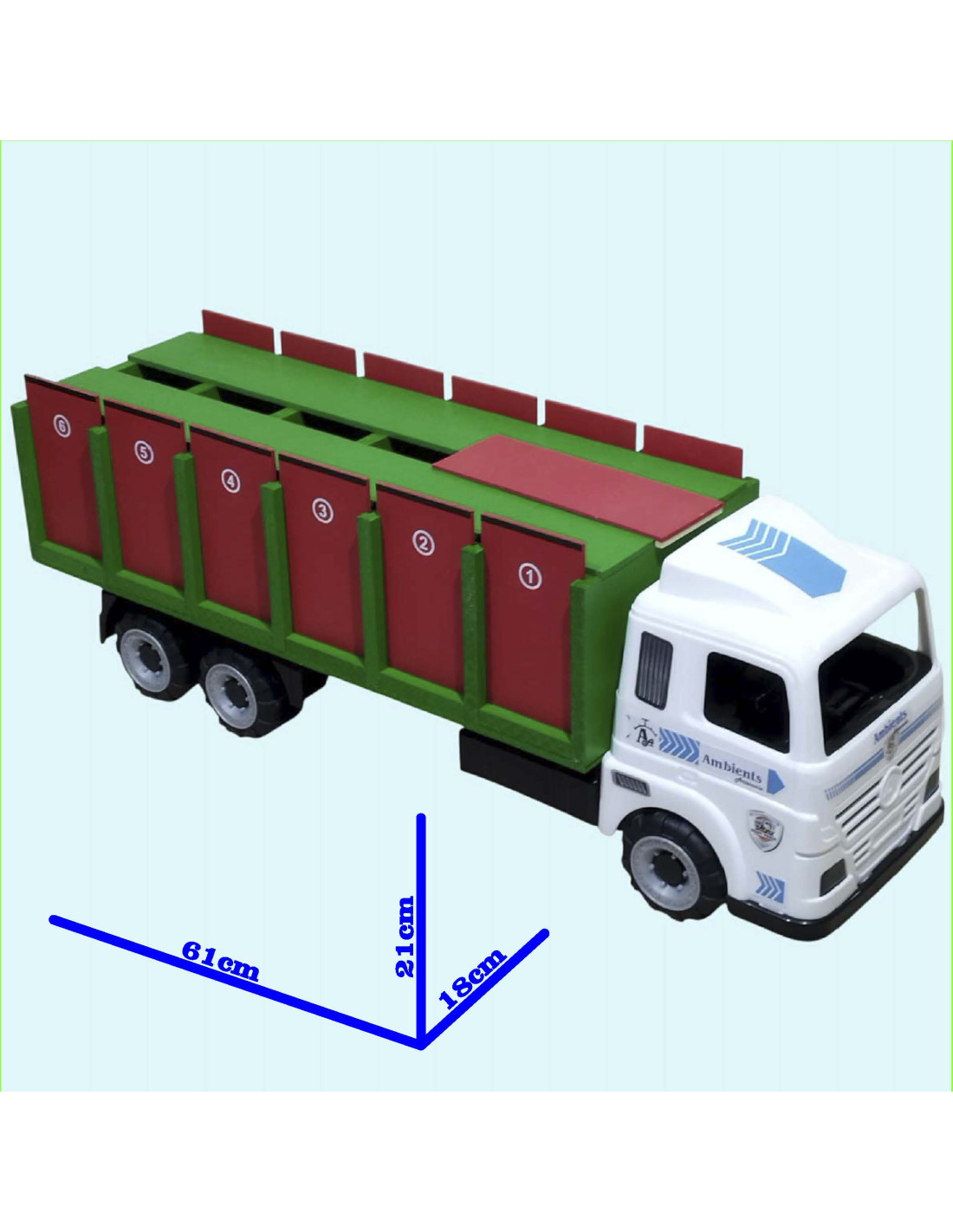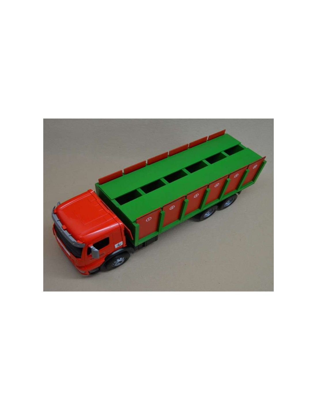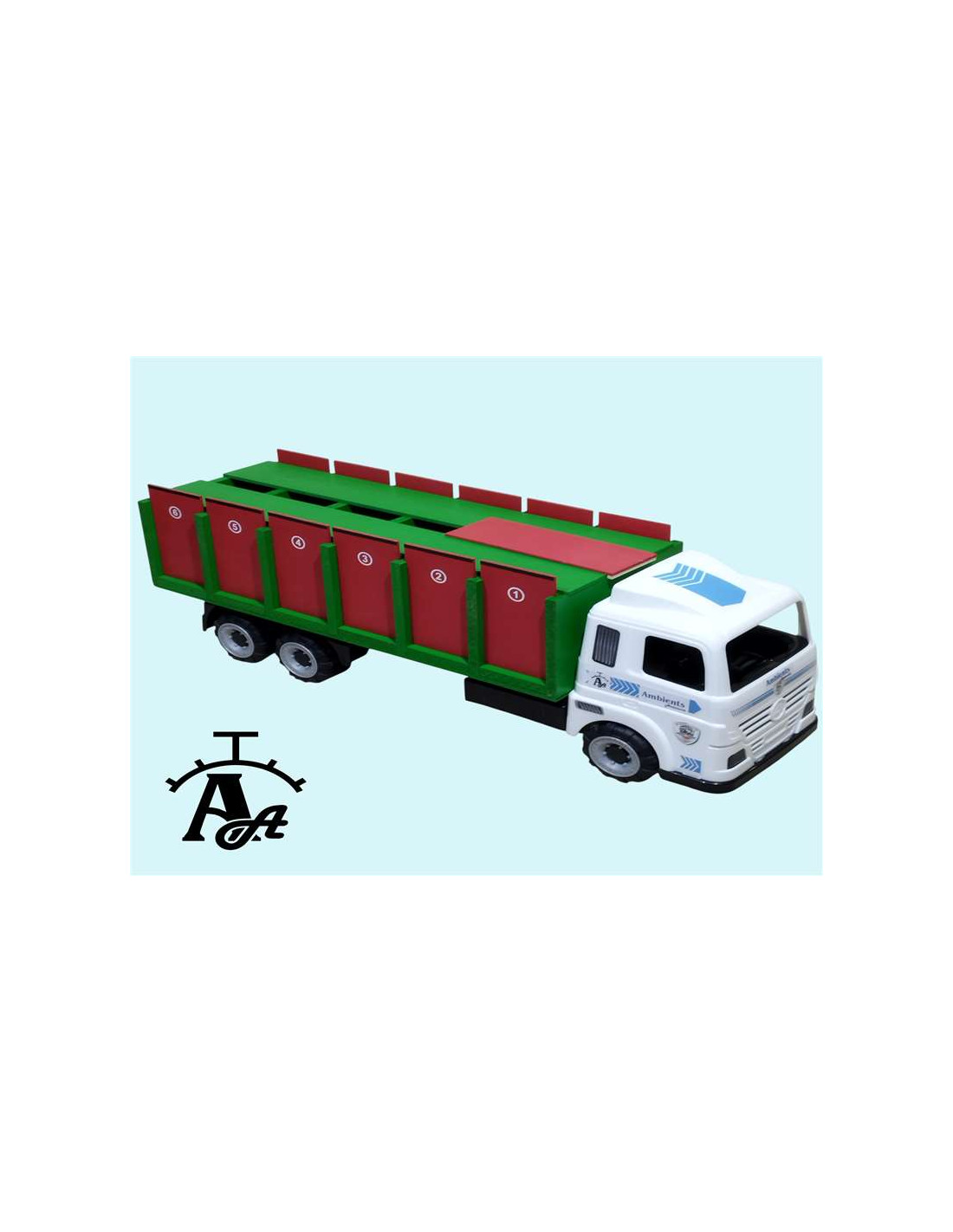 Este tipo de camión tiene una cabina de plástico, 6 ruedas, 1 cajón para toros grande en el que caben 6 animales, 12 puertas y 1 rampa. Medidas: 61 cm de largo x 18 cm de ancho x 21 cm de alto aproximadamente.
