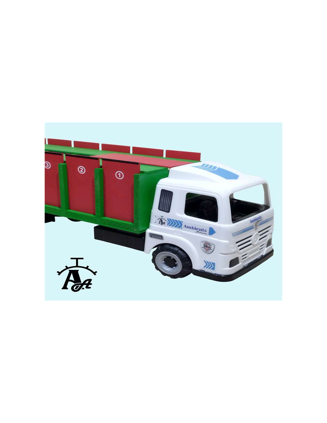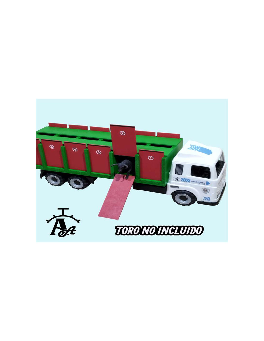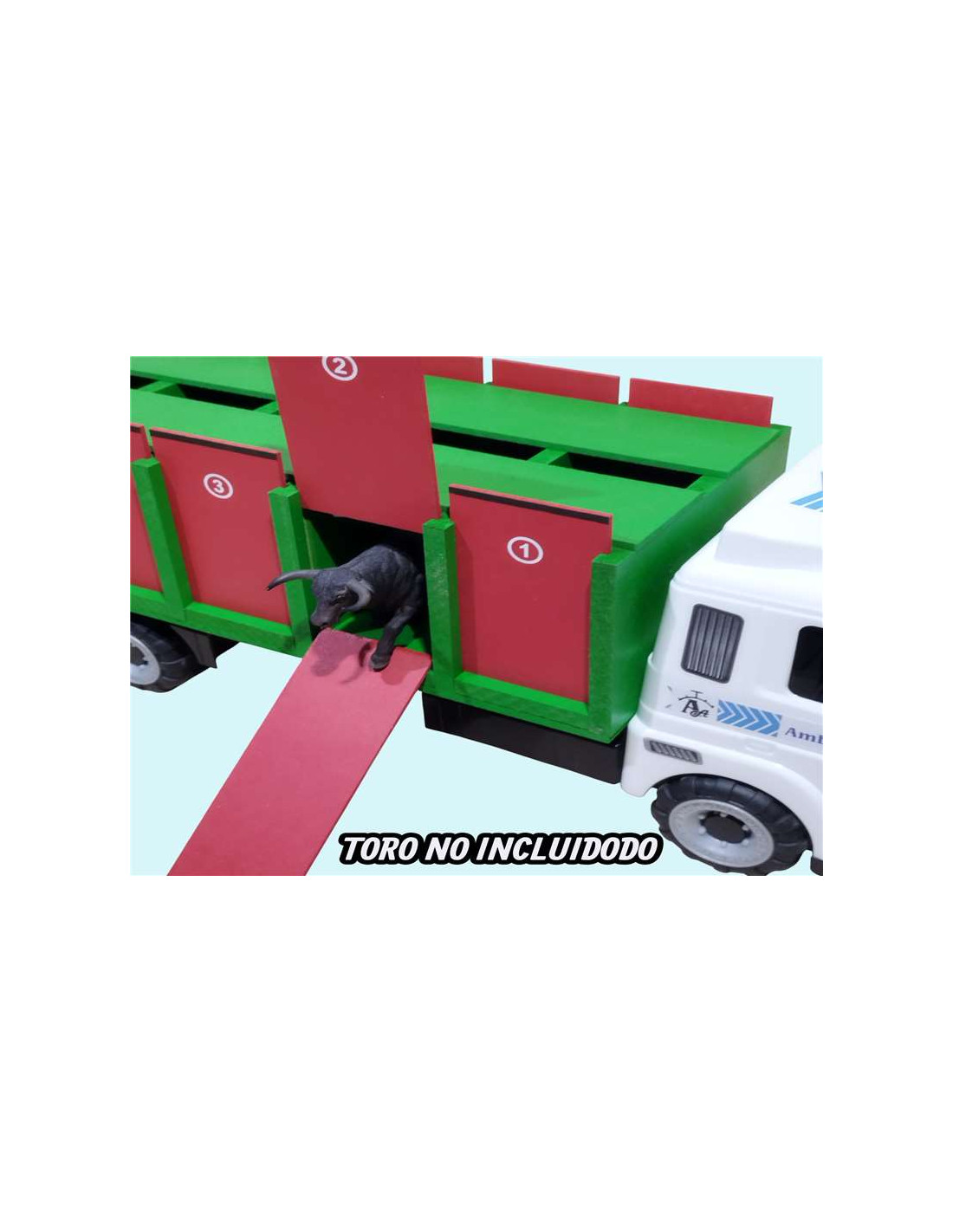 El camión no incluye el toro que se ve en las fotografías, se muestra a modo representativo. Puedes agregar al pedido algunos toros de resina que también tenemos en la tienda, y así tu pequeño tendrá todo lo necesario para jugar con este precioso camión.