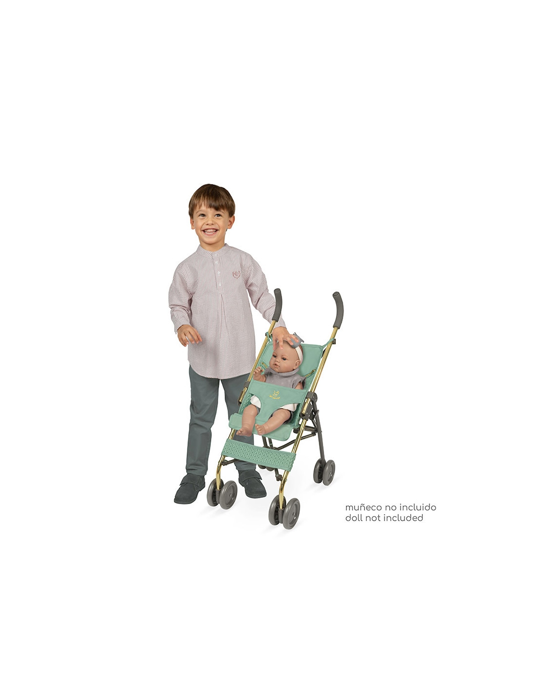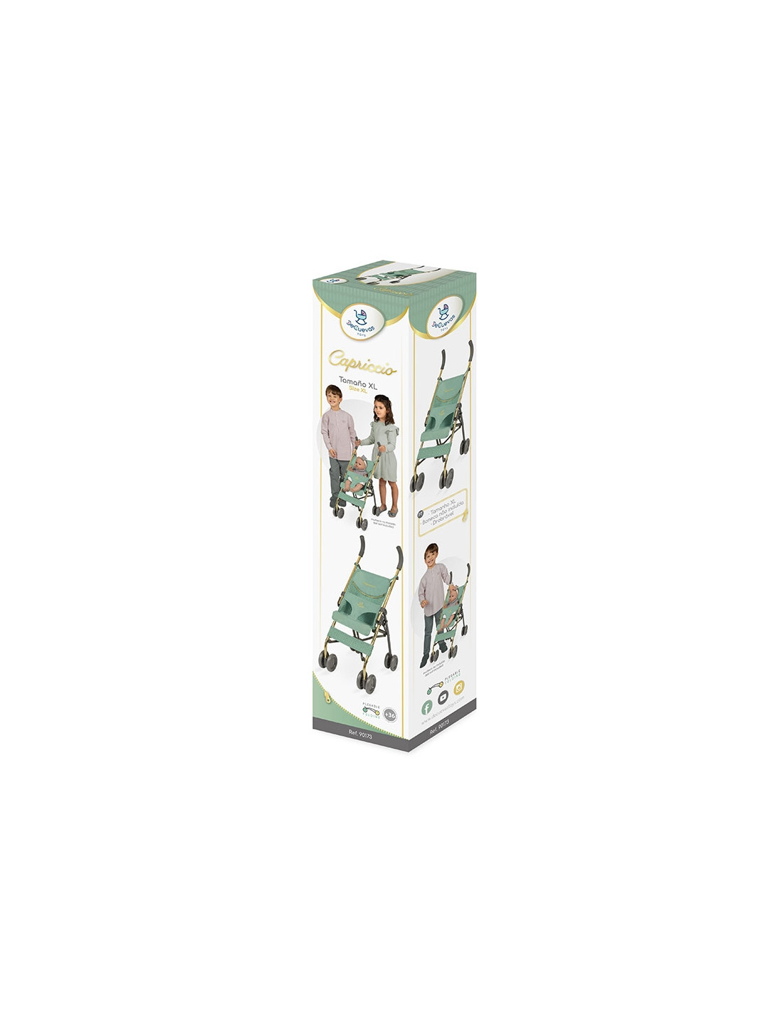 Incluye: 1 silla de muñeca XL de la linea Capriccio de color verde con cremallera dorada, parte de la estructura cromada, estructura plegable, empuñaduras acolchadas, reposapiés, ruedas dobles giratorias, banda frontal para succión de la muñeca, tela lisa y acolchada combinada, diseño ligero y muy resistente.