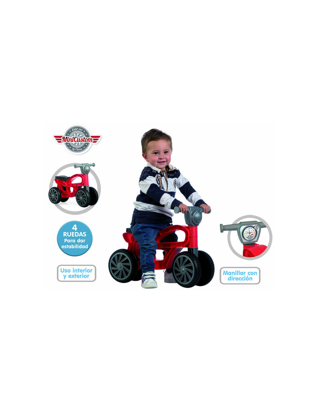 Fabrica de JuguetesCorrepasillos Mini Custom Rojo, un correpasillos Mini Custom color rojo de gran resistencia y durabilidad para los pequeños de la casa. Diseño moderno inspirado en una moto Custom clásica. Correpasillos muy ligero, práctico y seguro con 4 ruedas para dar mayor estabilidad. Apto para interior y exterior. Edades recomendadas 10 a 36 meses.