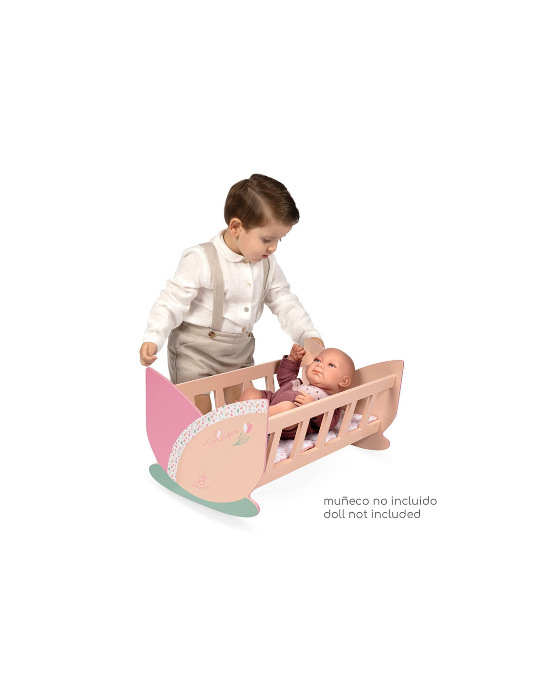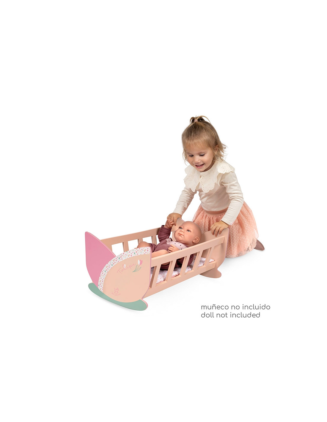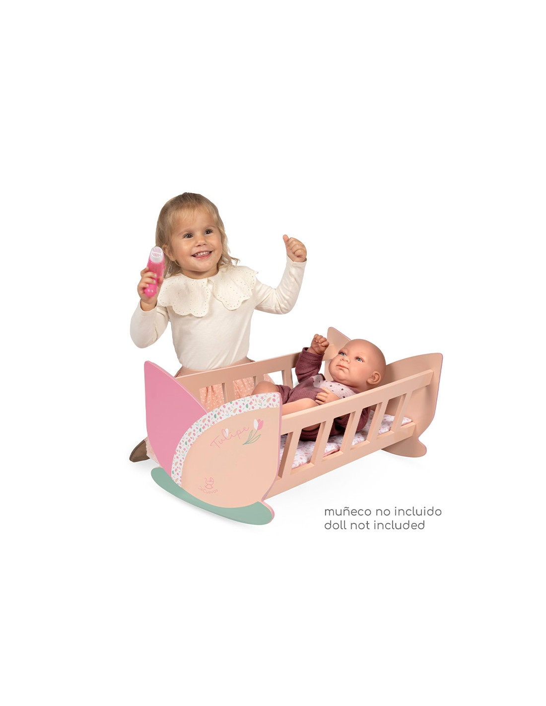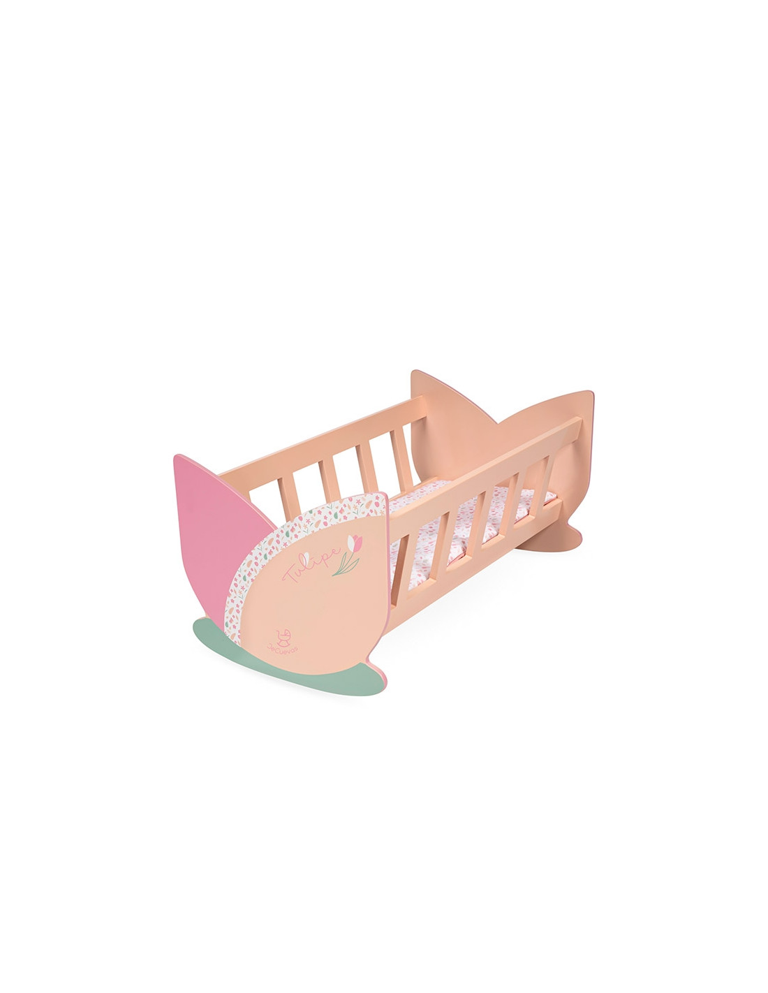 Incluye: 1 cuna de madera para muñecas serigrafiada con diseño especial de la linea Tulipe de color rosa, colchón con diseño especial de la colección y muchos más detalles de lujo.