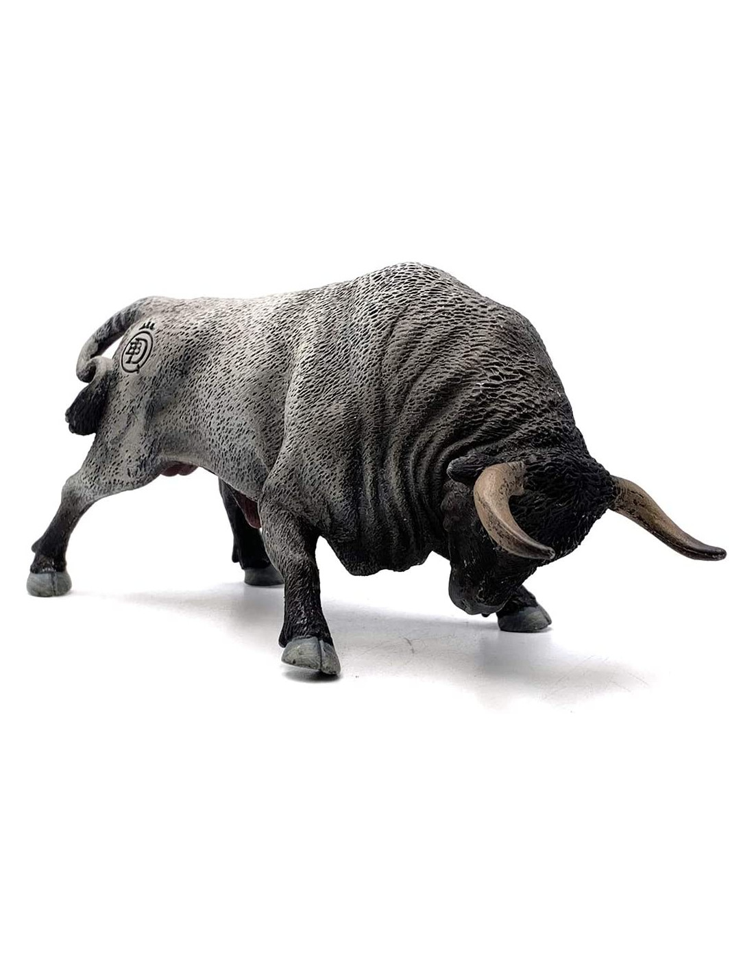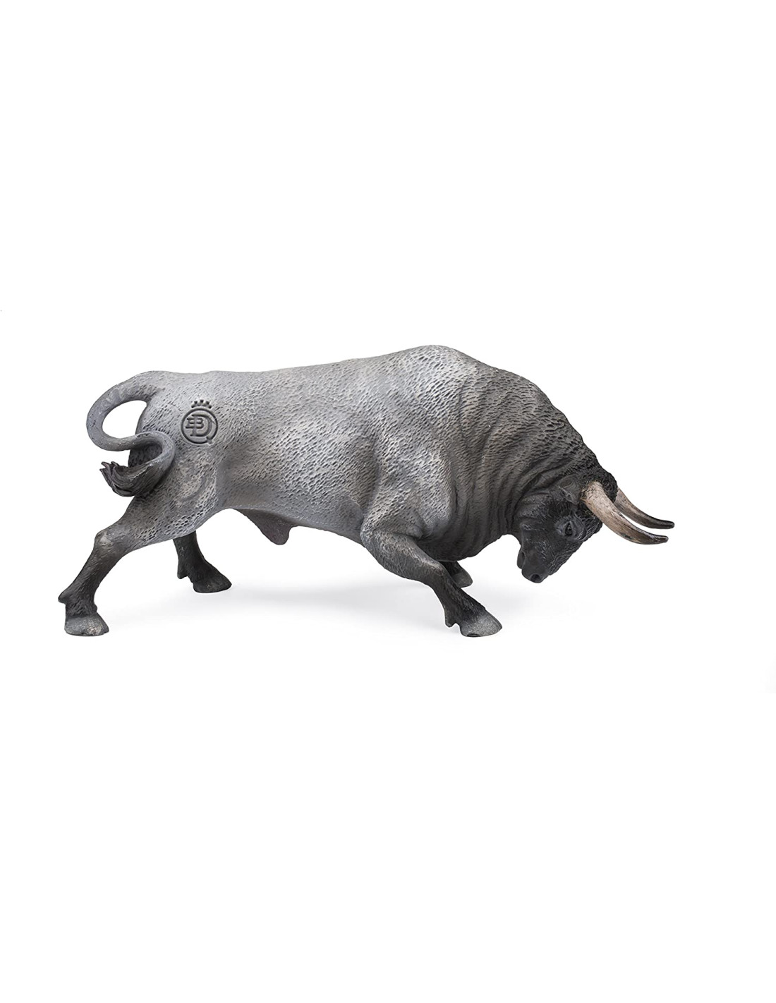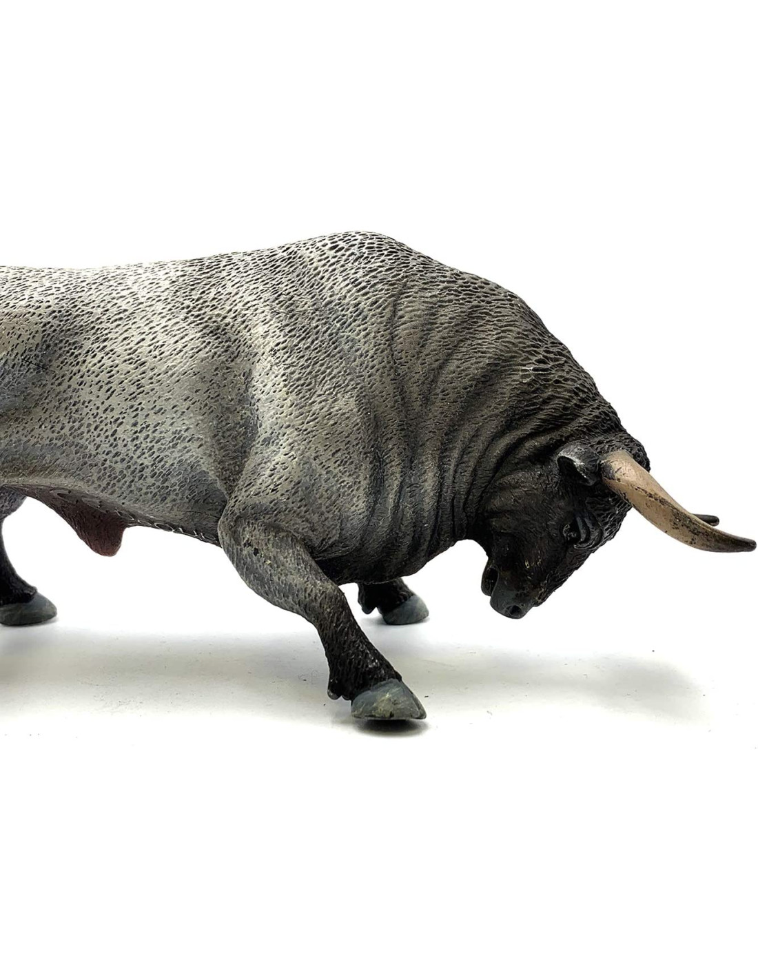 REPLICA A ESCALA del toro Bravo español de alta calidad y durabilidad. Este modelo está hecho en actitud embistiendo, es decir, atacando. El pelaje elegido es el denominado Cárdeno, con una mezcla de pelos negros y blancos, dándole un aspecto grisáceo.