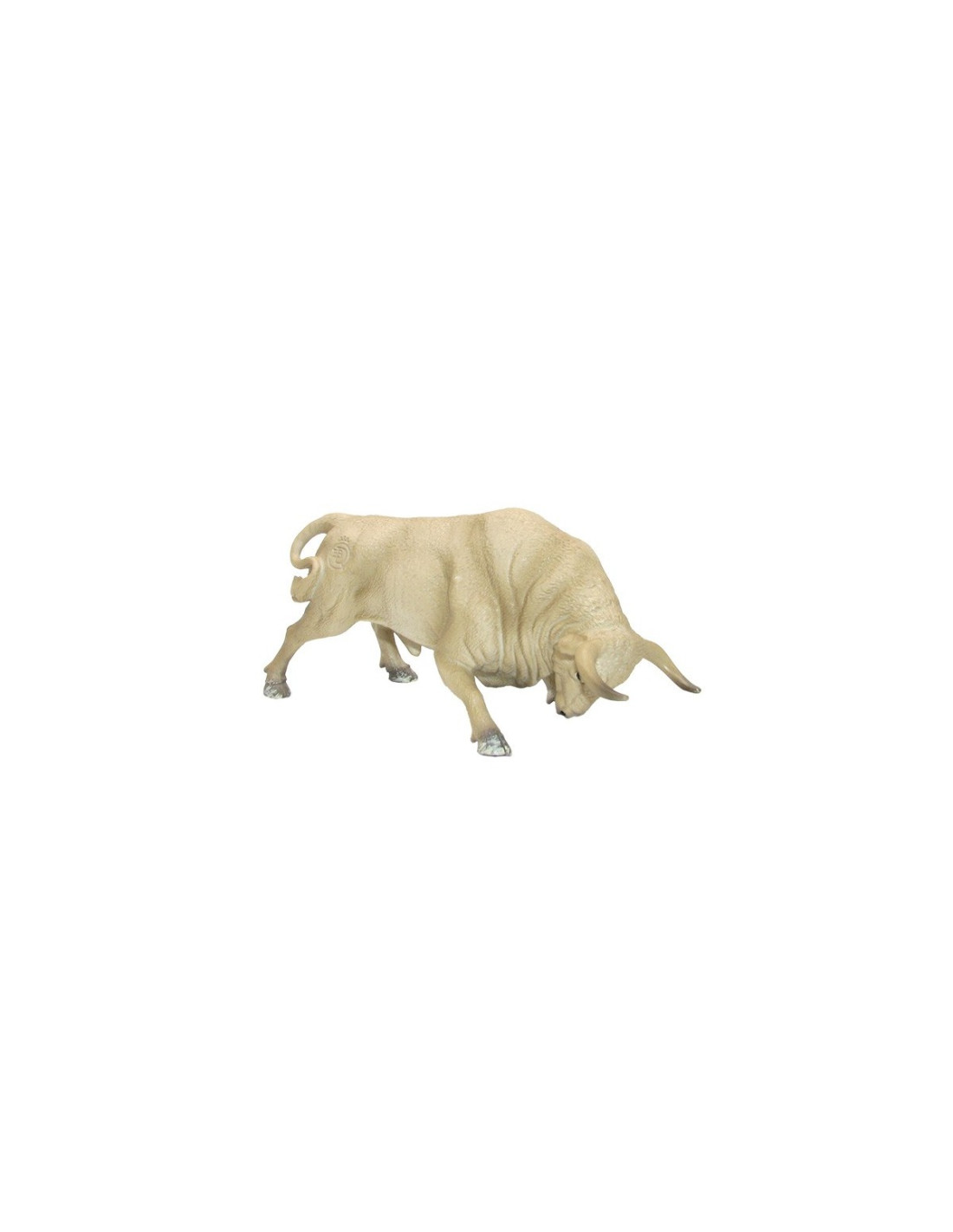 DeQUBE TradingEl Toro bravo es un tipo de bovino que proviene del Uro (toro salvaje del neolítico) ya introducido en el Norte de España y Portugal por los Celtas. El toro actual es el resultado de una selección efectuada desde el S. XVIII por los ganaderos españoles eligiendo para la reproducción aquellos ejemplares con características diferentes y con la Bravura como denominador común a todos ellos. Es un animal de fuerte temperamento acostumbrado a vivir en libertad, es arisco y desconfiado lo que hace que agudice los instintos y aprenda con facilidad. El toro Bravo simboliza la fiesta popular y aparece en todas las artes desde las pinturas rupestres hasta las tendencias más modernas de la cultura española (pinturas, grabados, cine y literatura). Se trata de una de las mayores joyas de la zootecnia mundial. El toro desarrollado por Deqube se presenta hecho en resina, como una réplica real con el máximo detalle en su trapío. Está pintado a mano Este modelo está hecho en actitud embistiendo, es decir, atacando. El toro utiliza sus astas dirigiendose al objeto de su ataque humillando la testuz y seguidamente levantando la cabeza para recoger y rematarlo. El pelaje elegido es el denominado Jabonero,de pelo en color vainilla.