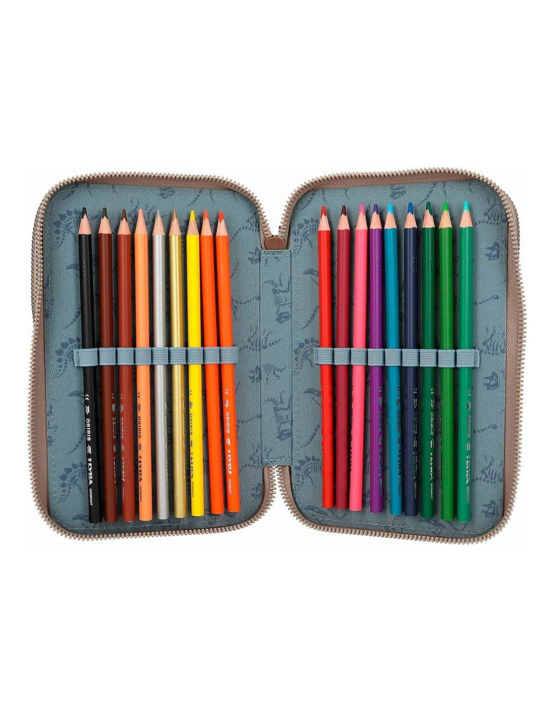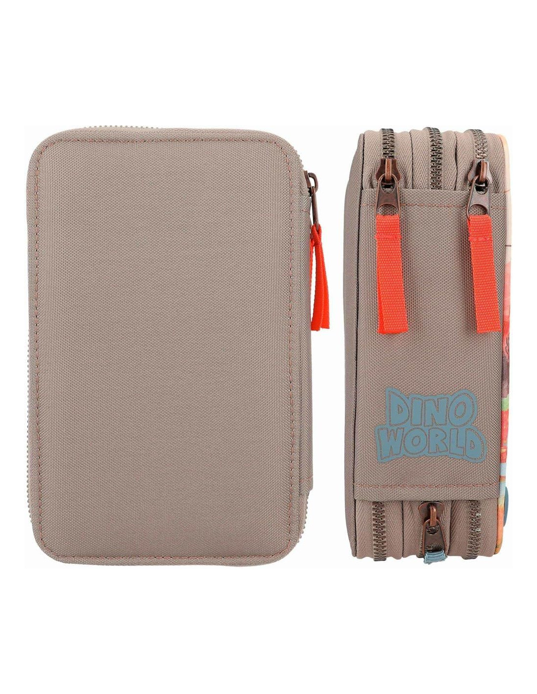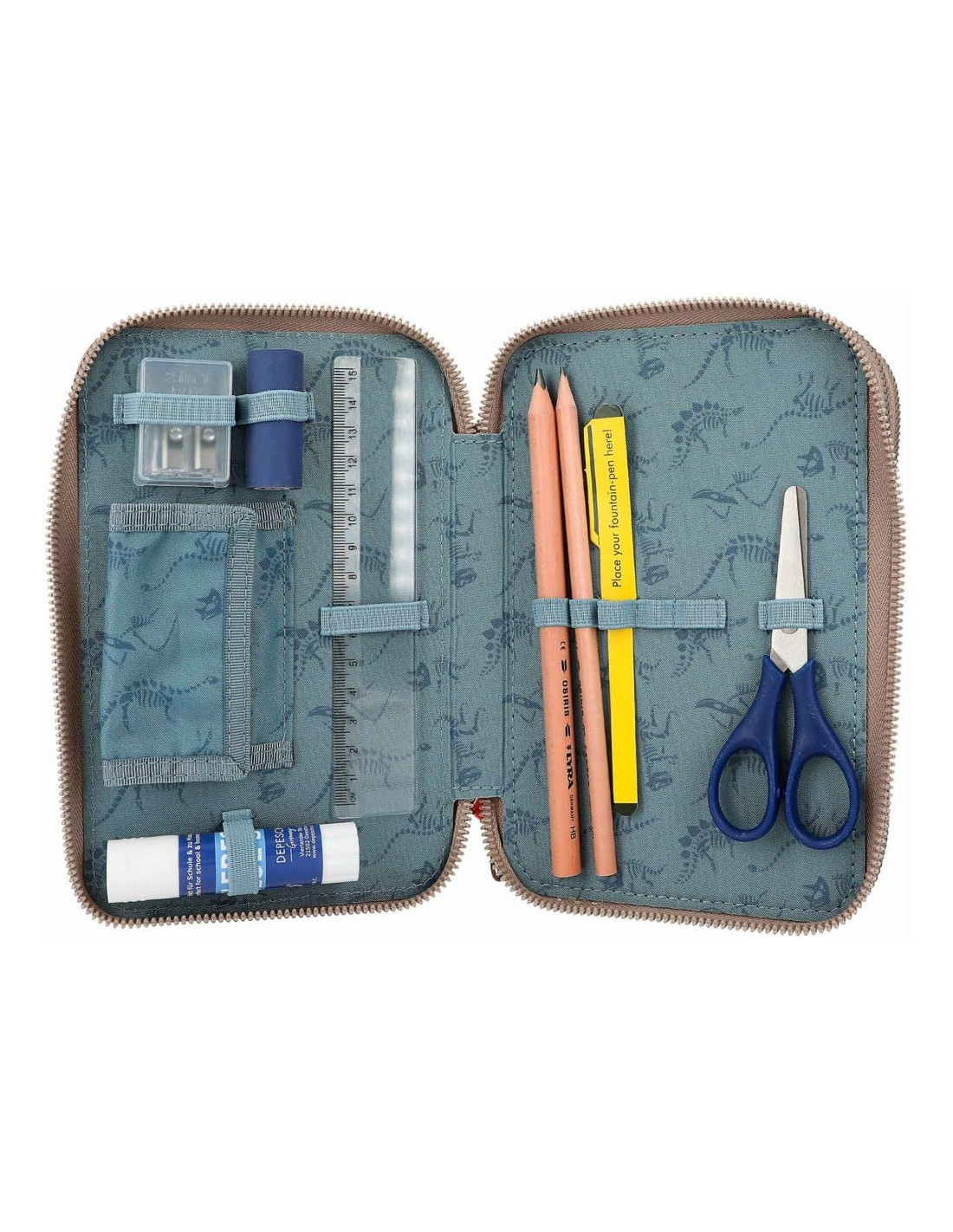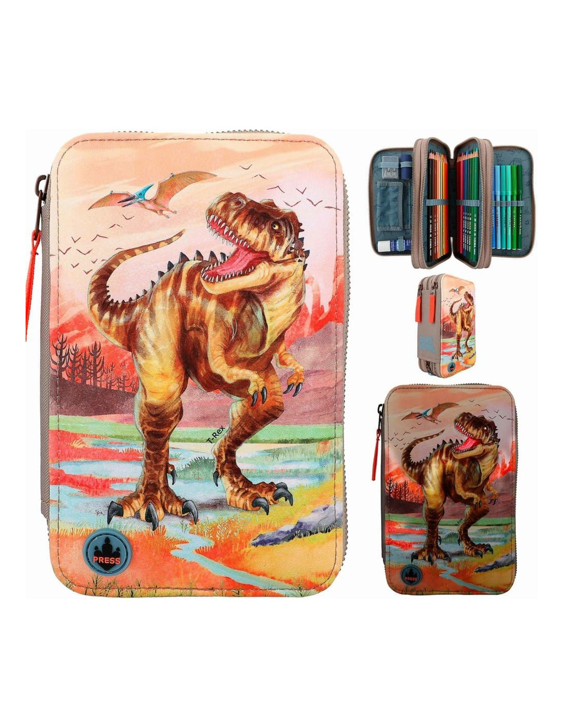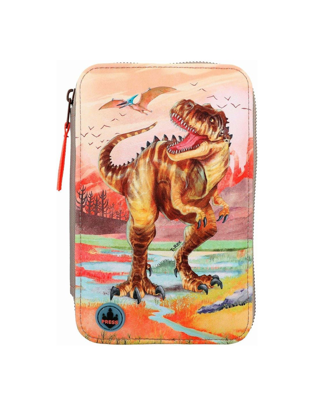 DepescheEstuche Dino World con un gran T-rex y una escena prehistórica en frescos tonos tierra que revela un gran secreto con solo tocar un botón. Durante aproximadamente 20 segundos, la boca y los ojos del dinosaurio se iluminan, así como la divertida calavera del dinosaurio.