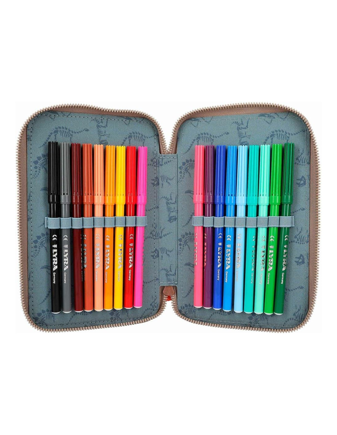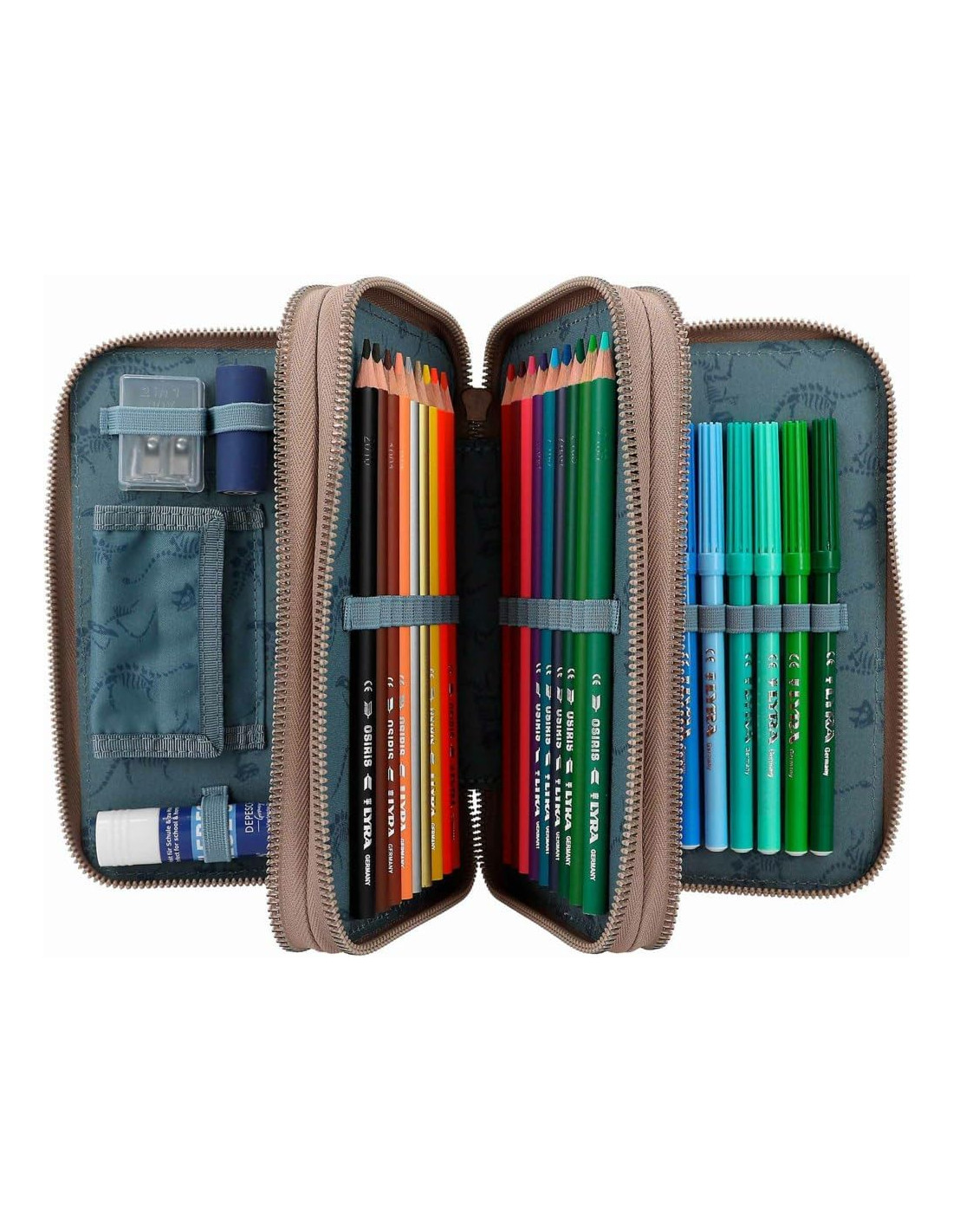 Los tres compartimentos están completamente llenos con 18 lápices de colores, 18 rotuladores, 2 lápices, una goma de borrar, un sacapuntas, una regla, unas tijeras, una barra de pegamento y un pequeño bolsillo con velcro.