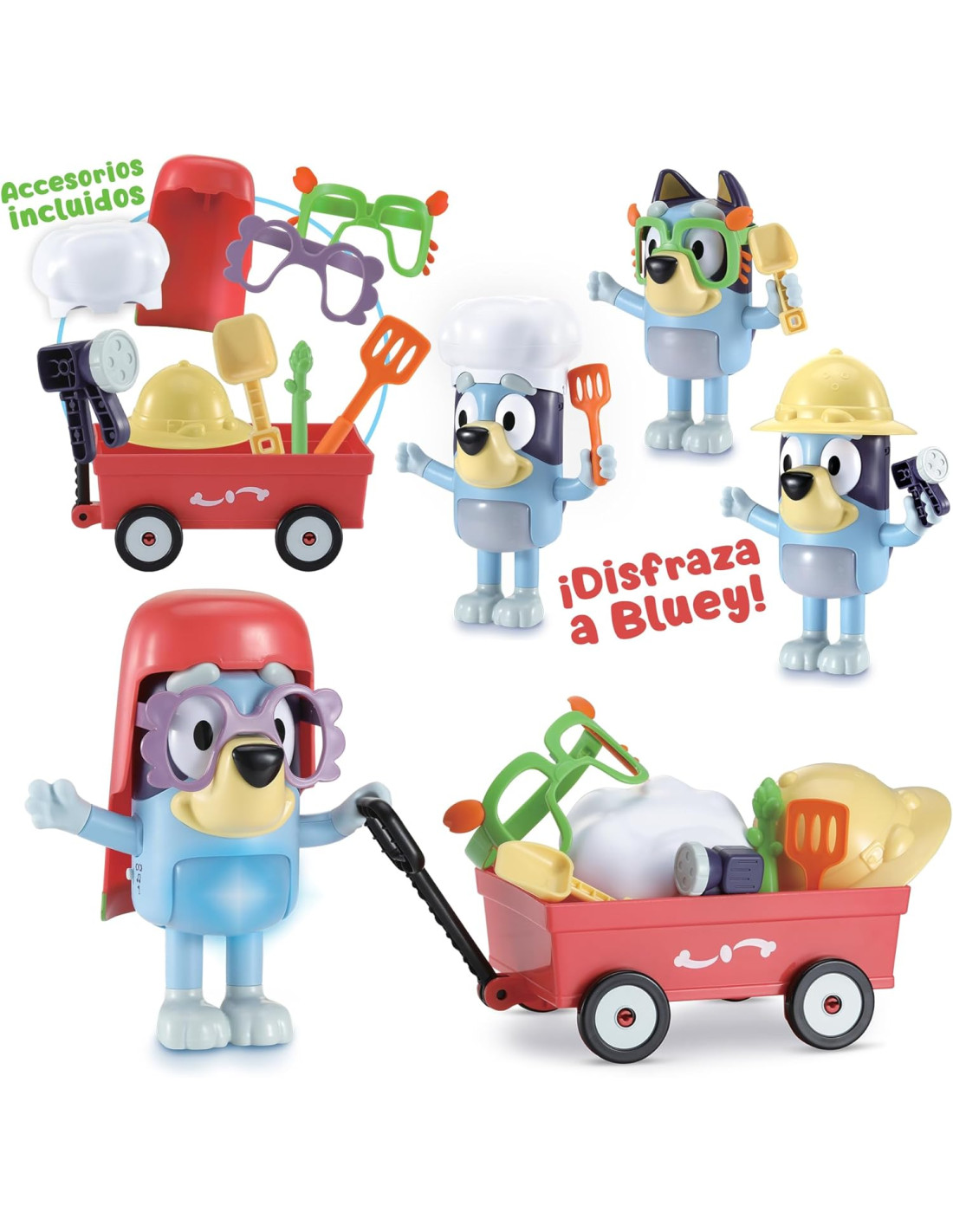 ?? DISFRACES QUE COBRAN VIDA: Ponle gorro, gafas o manta y Bluey responderá con más de 150 frases, sonidos y ojos que se mueven; tu peque explorará identidades y ampliará vocabulario mientras juega a “ser otro”.
