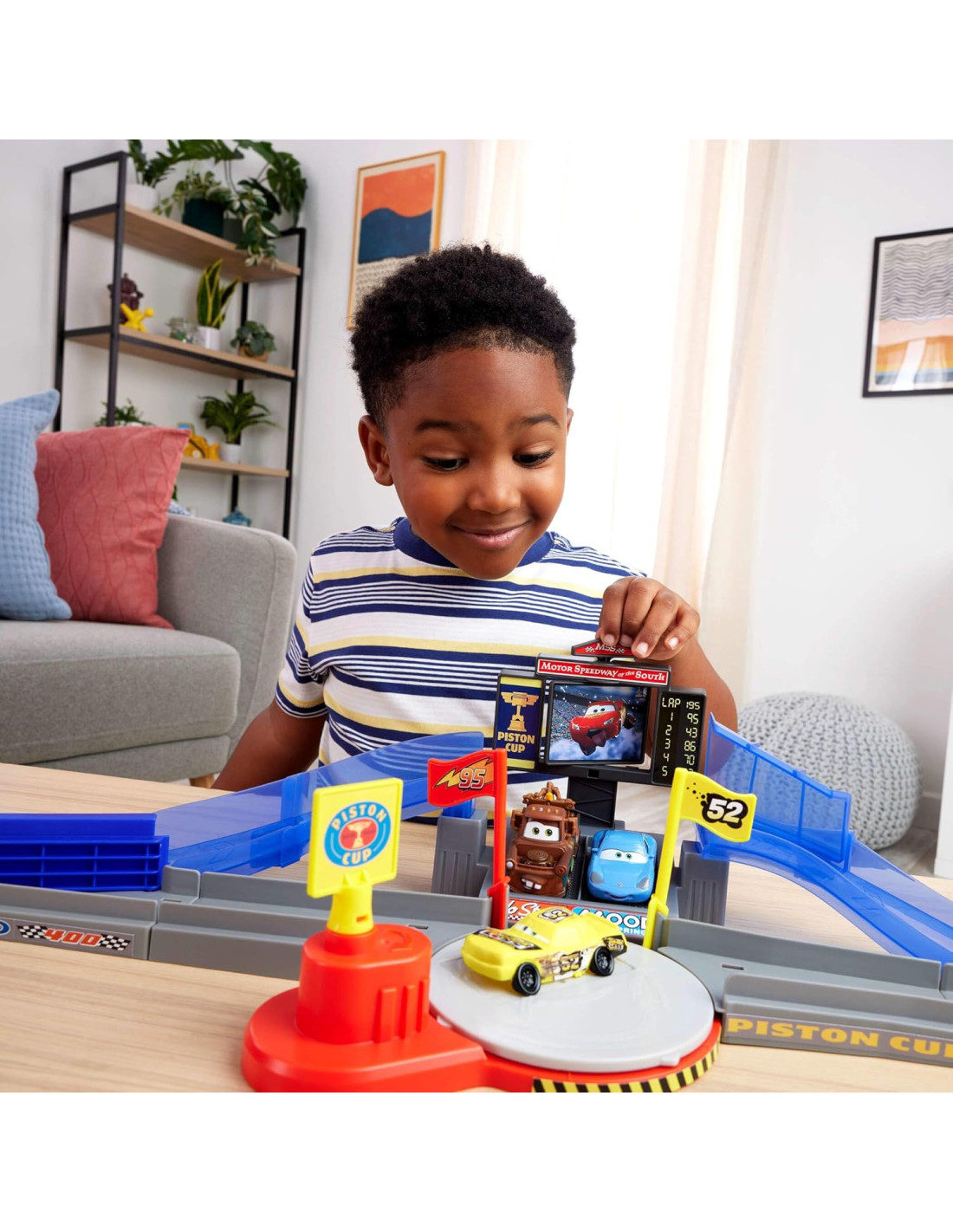 MattelJuega a las carreras y los choques con el Rayo McQueen burlón del conjunto de juego Copa Pistón de Disney y Pixar Cars.