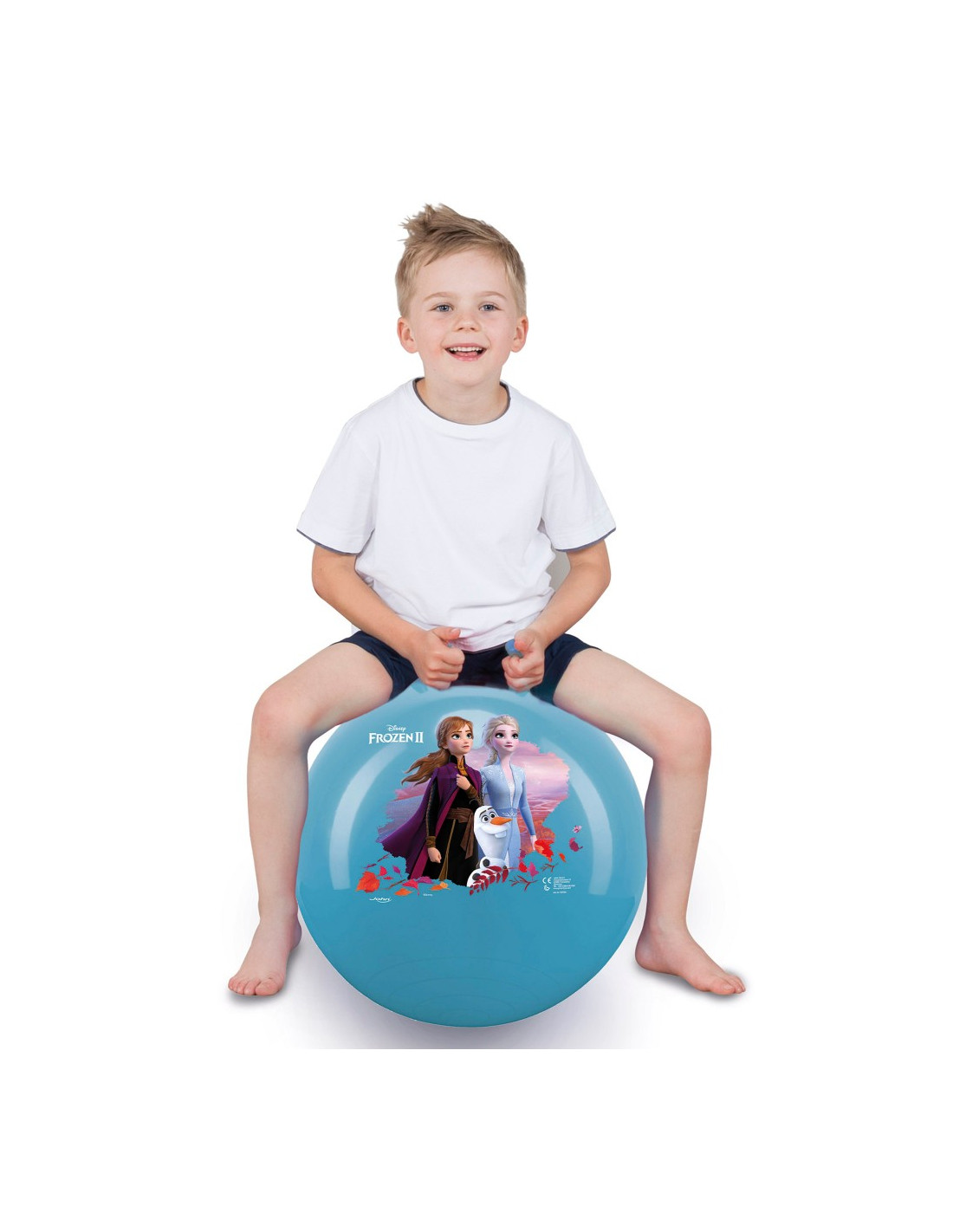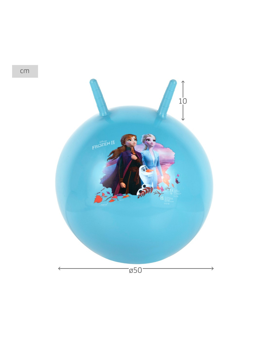 Diseño: pelota saltarina color azul con agarres ergonómicos de 10 cm de alto e ilustración de Elsa, Anna y Olaf de Frozen II