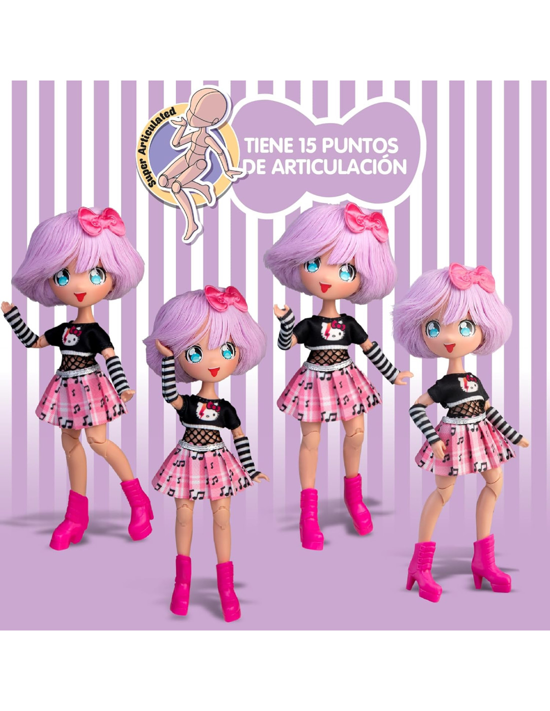 Inspirada en el vibrante mundo de la moda manga, esta muñeca combina la ternura característica de Hello Kitty con un aire moderno y atrevido, optimo para coleccionistas y amantes de la cultura japonesa