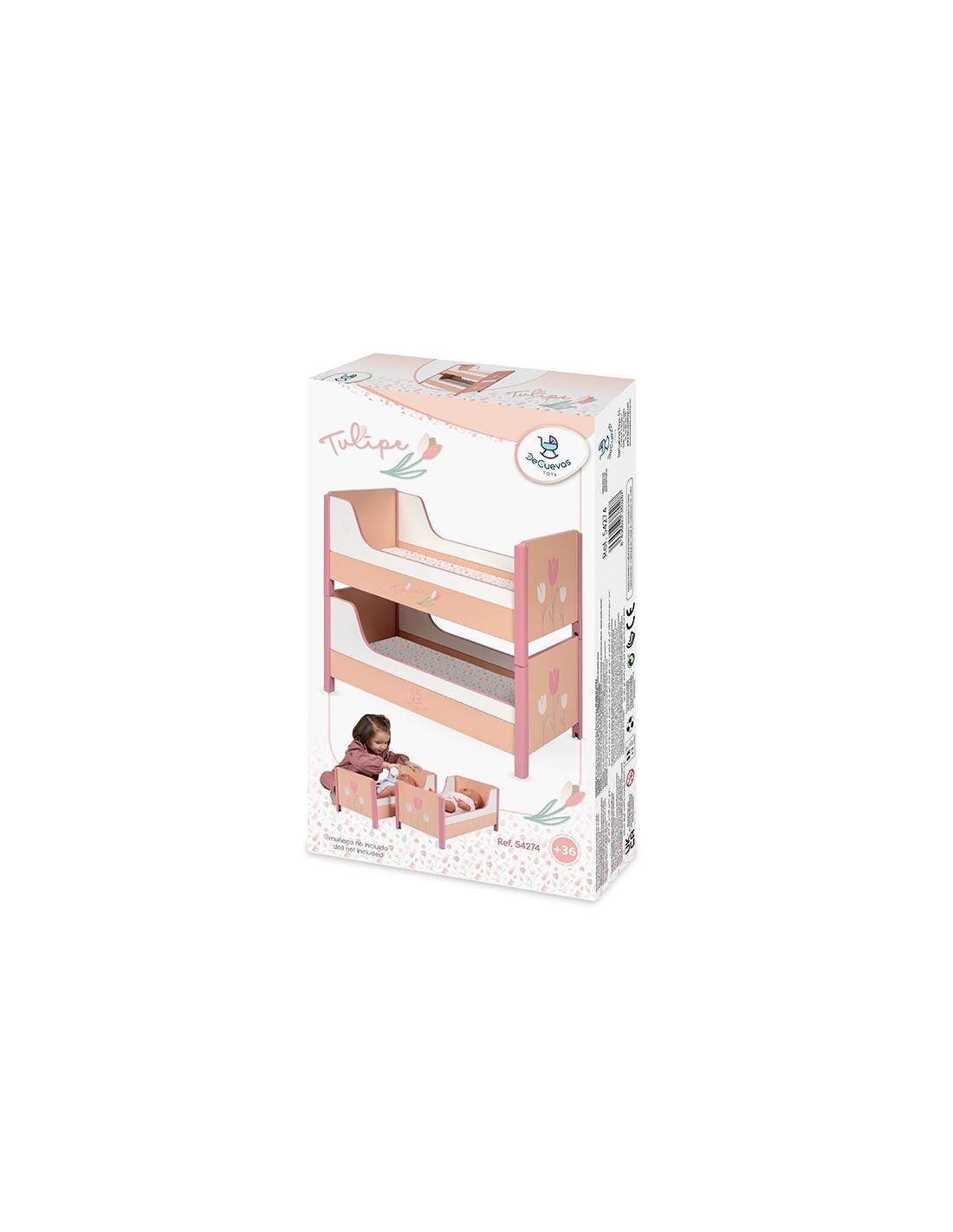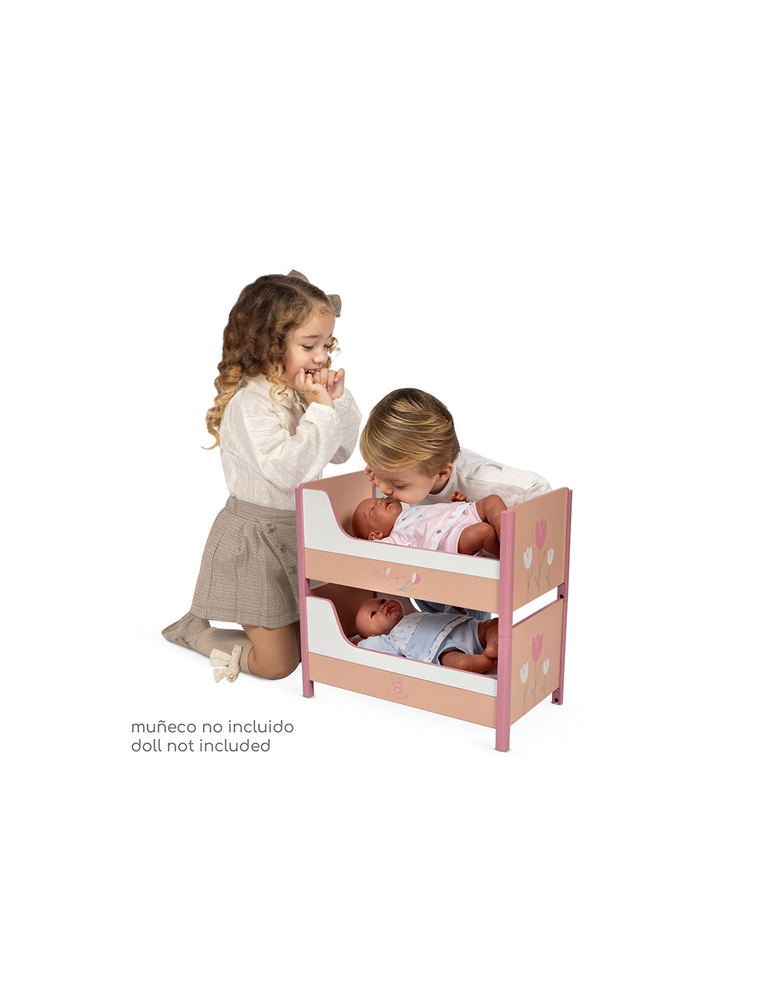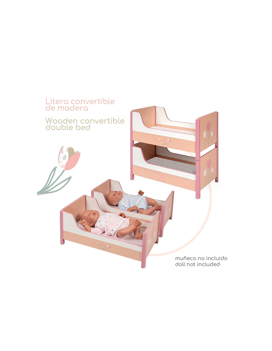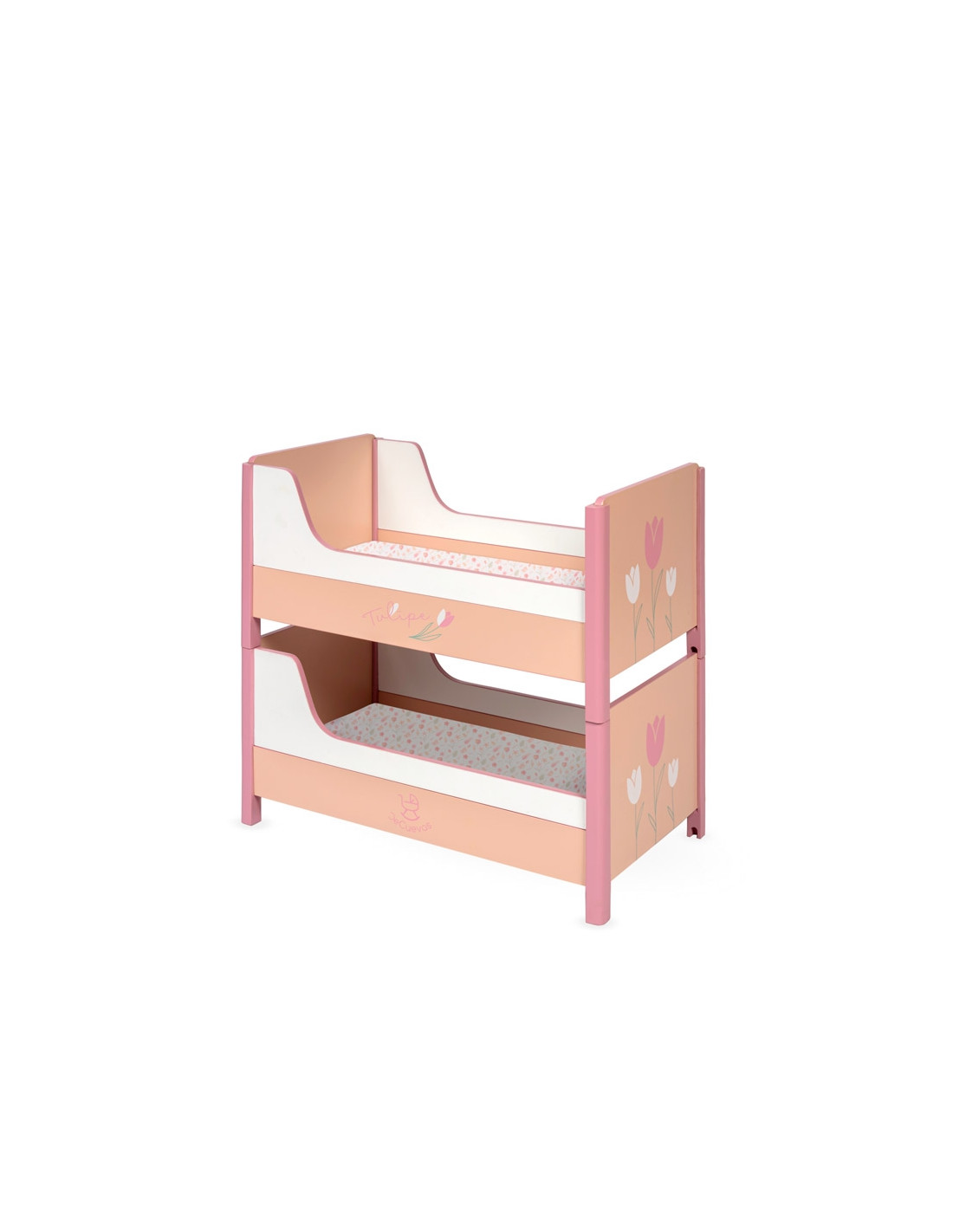 Incluye: 1 litera de madera para muñecas serigrafiada con diseño especial de la colección Tulipe convertible en dos camitas, dos colchones con diseño especial a juego y muchos más detalles de lujo.