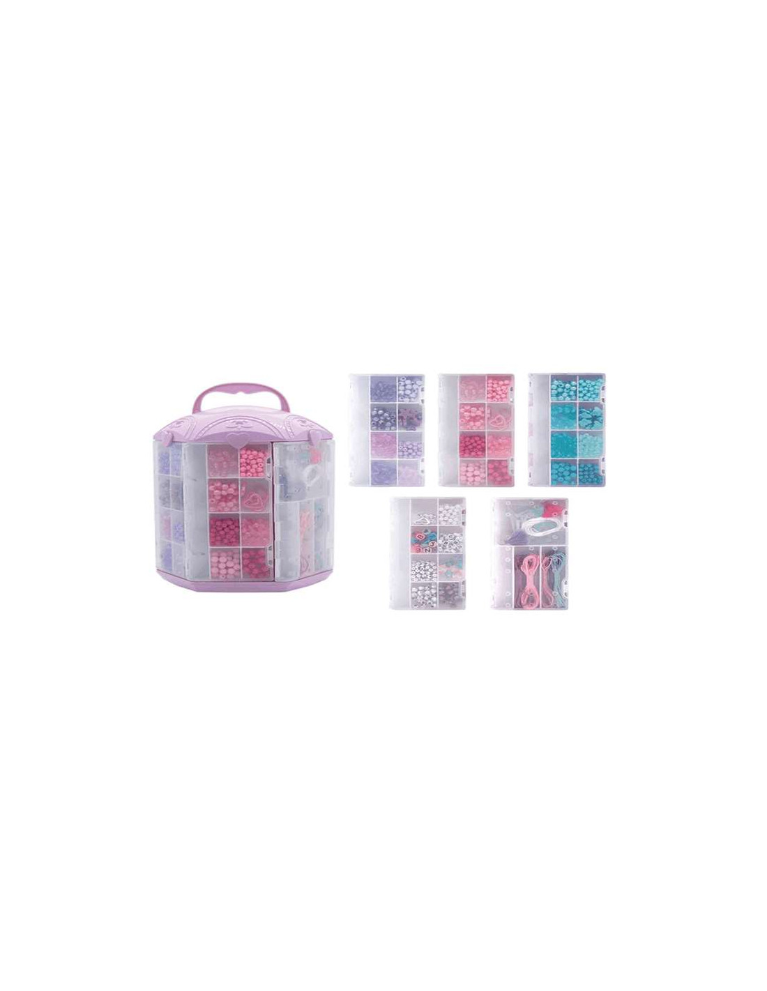 Cómo se utiliza: Gira el joyero para elegir las cuentas, combina colores y empieza a crear. Introduce las cuentas en el hilo elástico, juega con las formas y crea patrones personalizados. Cuando tu diseño esté completo, haz un nudo y corta el sobrante. Guarda los abalorios en su compartimento correspondiente para mantener el joyero siempre listo para la próxima sesión creativa.