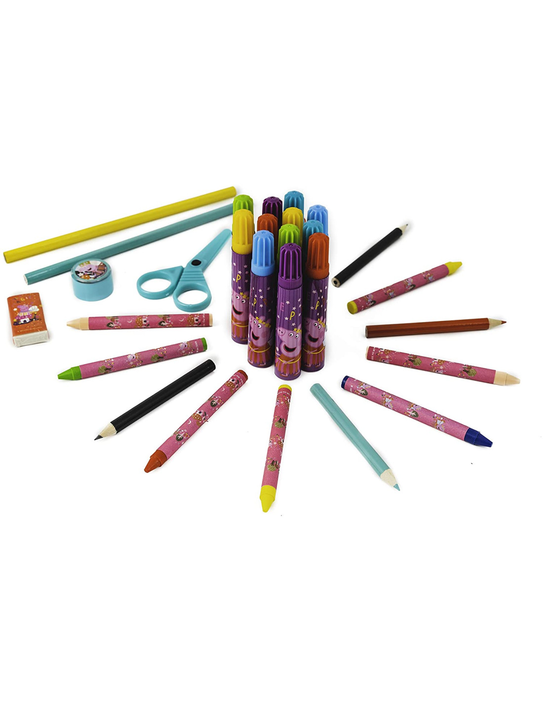 Incluye 50 piezas, 12 ceras,12rotuladores,12 acuarelas,6 pinturas,regla,2 lapiceros,1 tijeras y 1 saca puntas