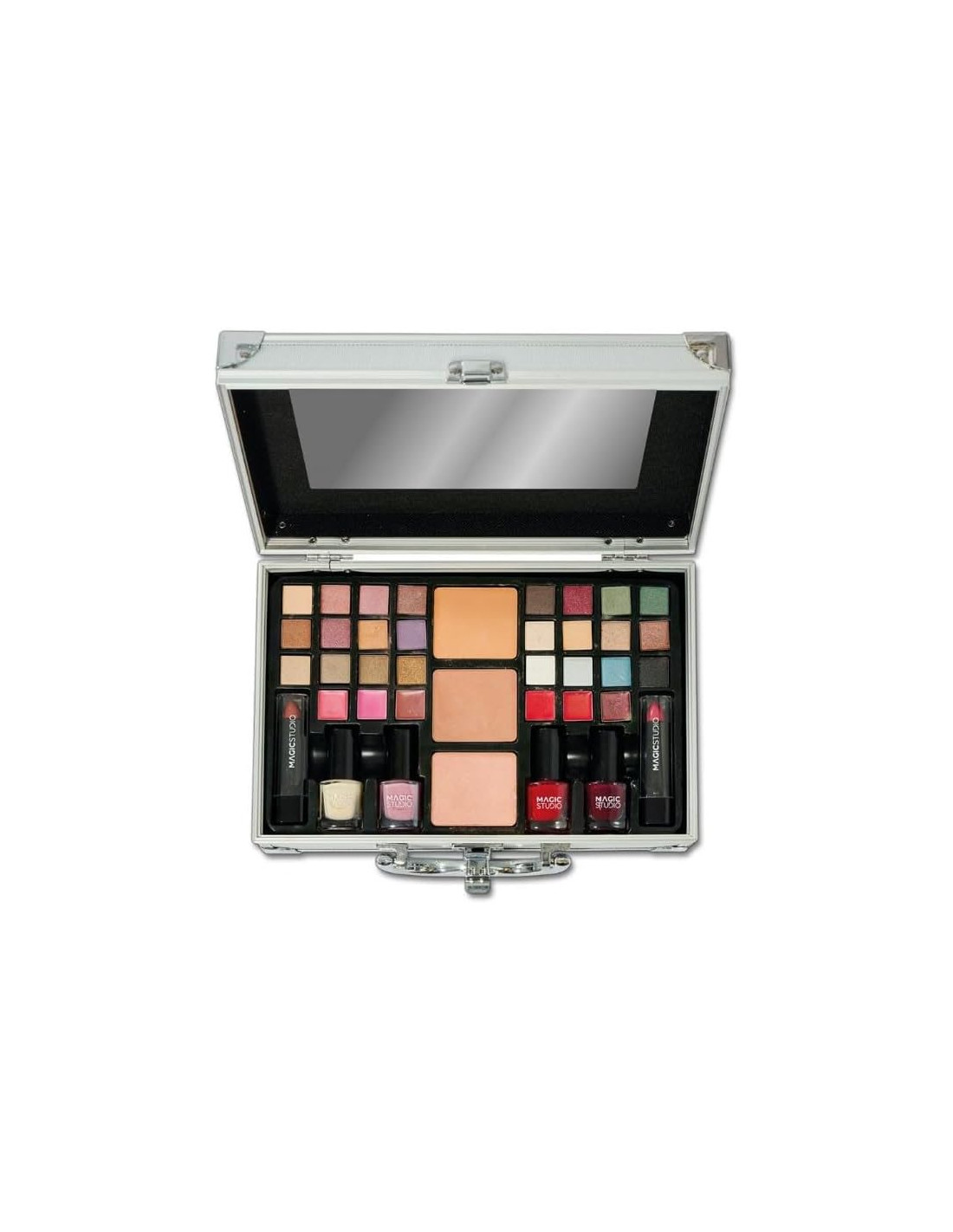 Este maletín es muy completo y tiene todo lo necesario para l@s amantes del maquillaje: 24 sombras de ojos, 6 labiales, 4 lacas de uñas, 3 coloretes, y 2 barras de labios. Podrás encontrar todo lo que necesitas para crear tu look de maquillaje ideal. Viaja con tu maquillaje a cualquier lugar gracias a este maletín resistente en acabado plateado.