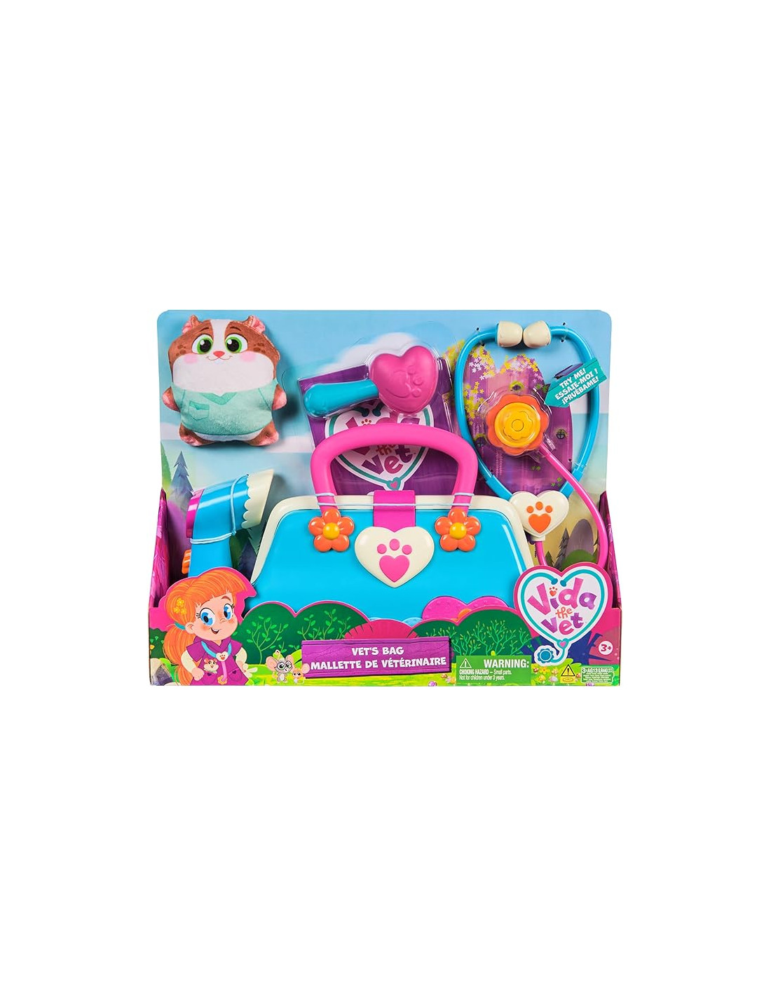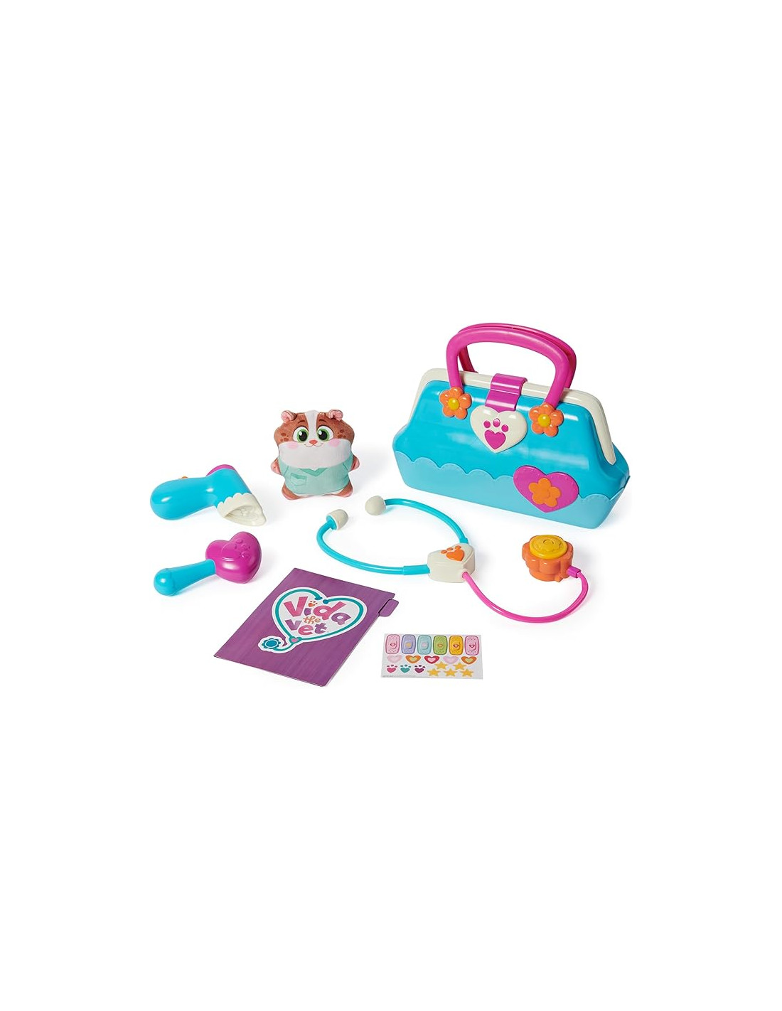 INCLUYE: 1 maletín de veterinaria, 4 juguetes con temática de veterinaria, 1 peluche hámster, 1 hoja con calcomanías