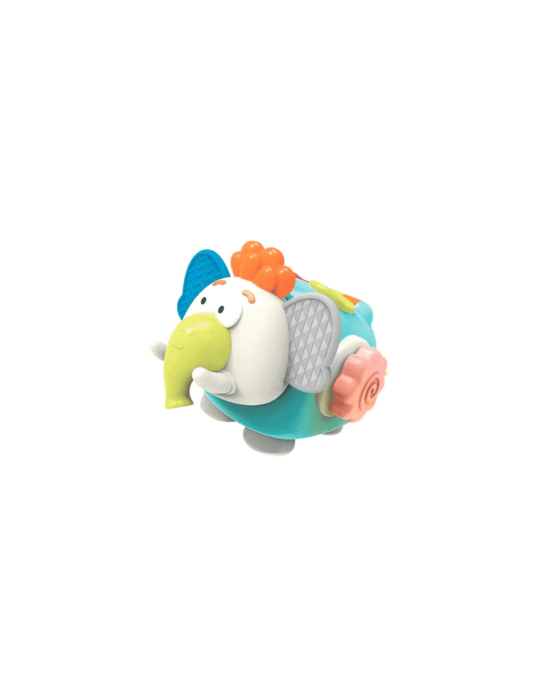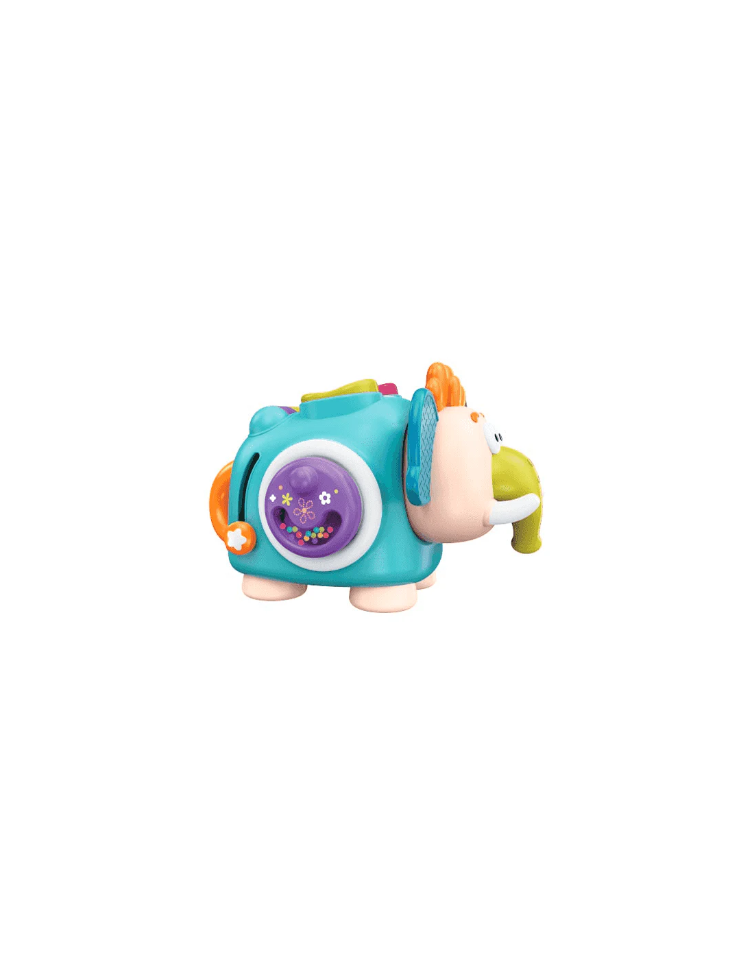Se trata de un juguete interactivo multisensorial con distintas actividades pensadas para fomentar la exploración y la motricidad. Incluye piezas móviles, botones giratorios, un interruptor bilateral y un asa adaptada a las pequeñas manos del bebé. Cada parte del mamut tiene una función: