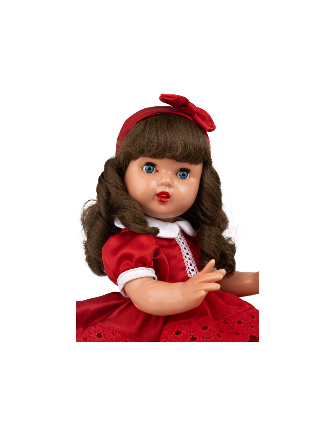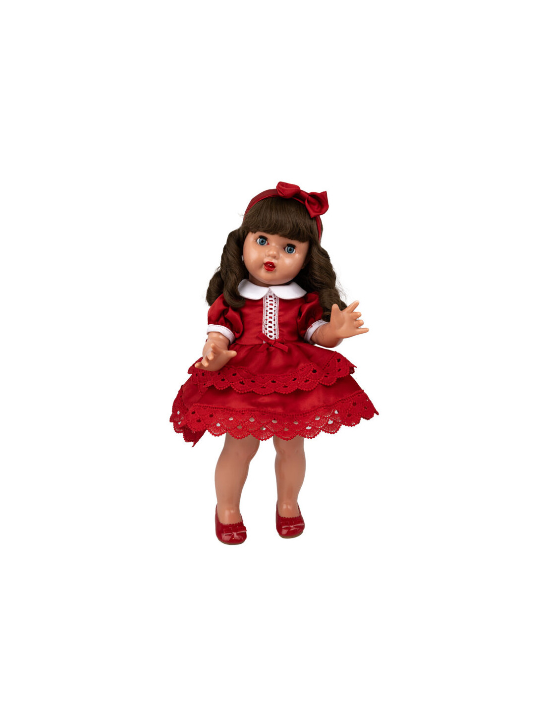 Nueva Colección 2025-2026. Melena de tirabuzones morena. Vestido rojo con detalles en blanco. Incluye libro de familia. 50cm Cocido a mano Cuerpo de vinilo Articulada