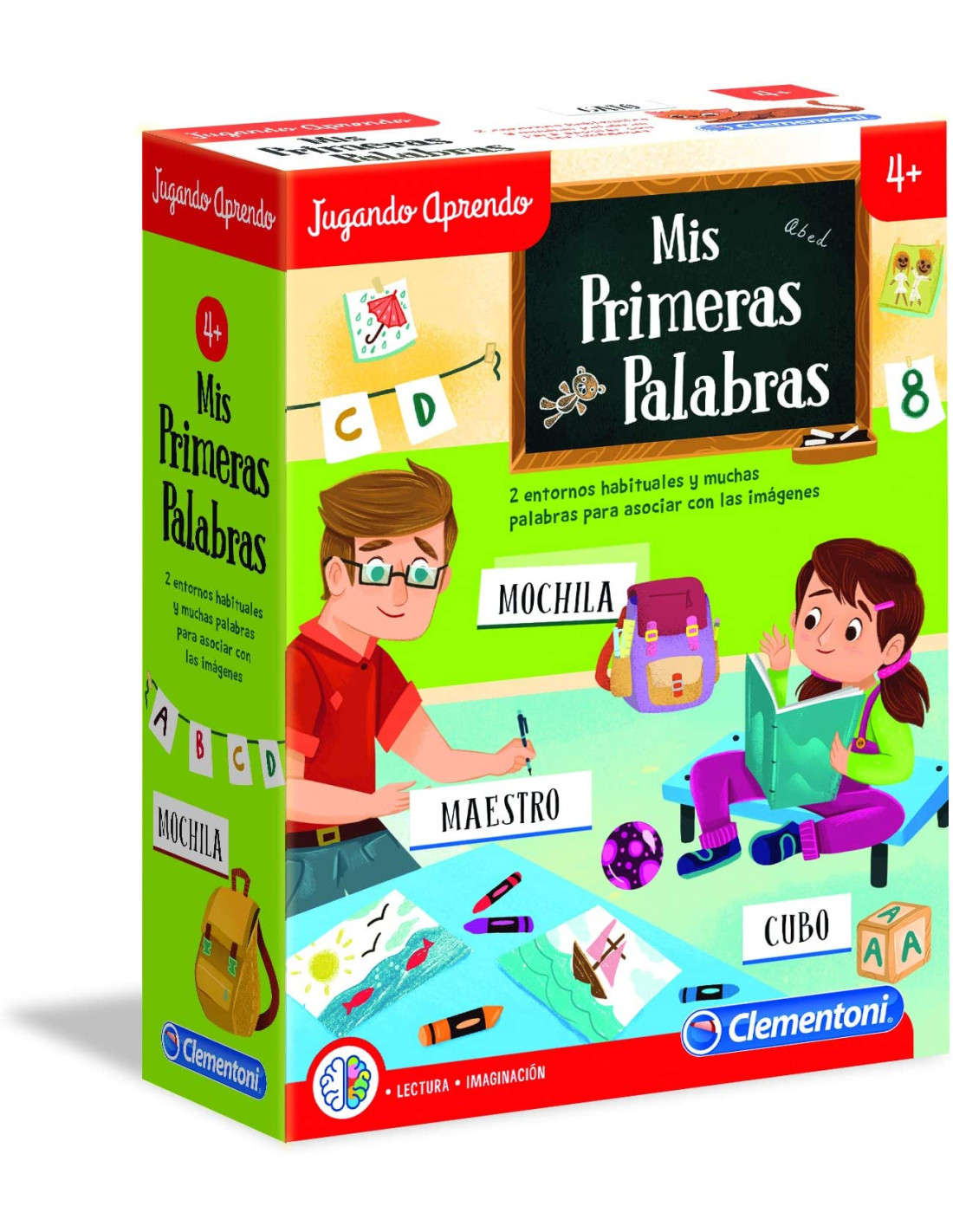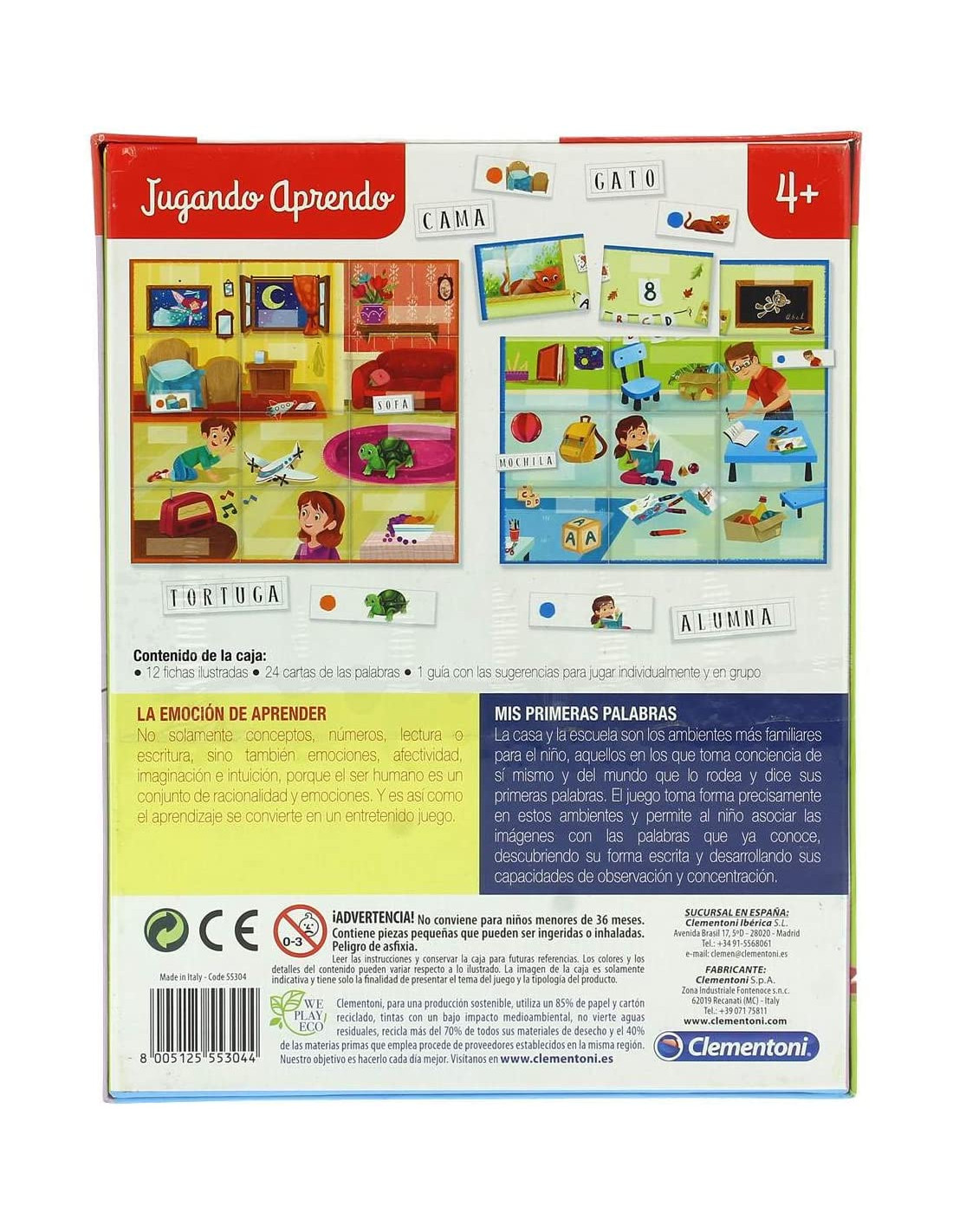 Juguete en español. Un sencillo y entretenido juego educativo que enseña a los niños a escribir sus primeras palabras. Cuando se unen, sus 12 fichas presentan 2 ambientes habituales: una casa en una cara y una escuela en la otra.