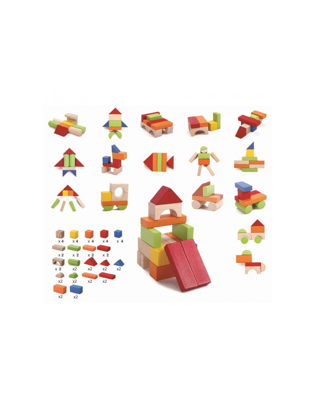 Conjunto de coloridos bloques de construcción con el que desarrollar la imaginación y la habilidad manual, mientras el niño pasa unas divertidas horas de juego. Favorece el reconocimiento de formas y colores. Juguete de madera Montessori.