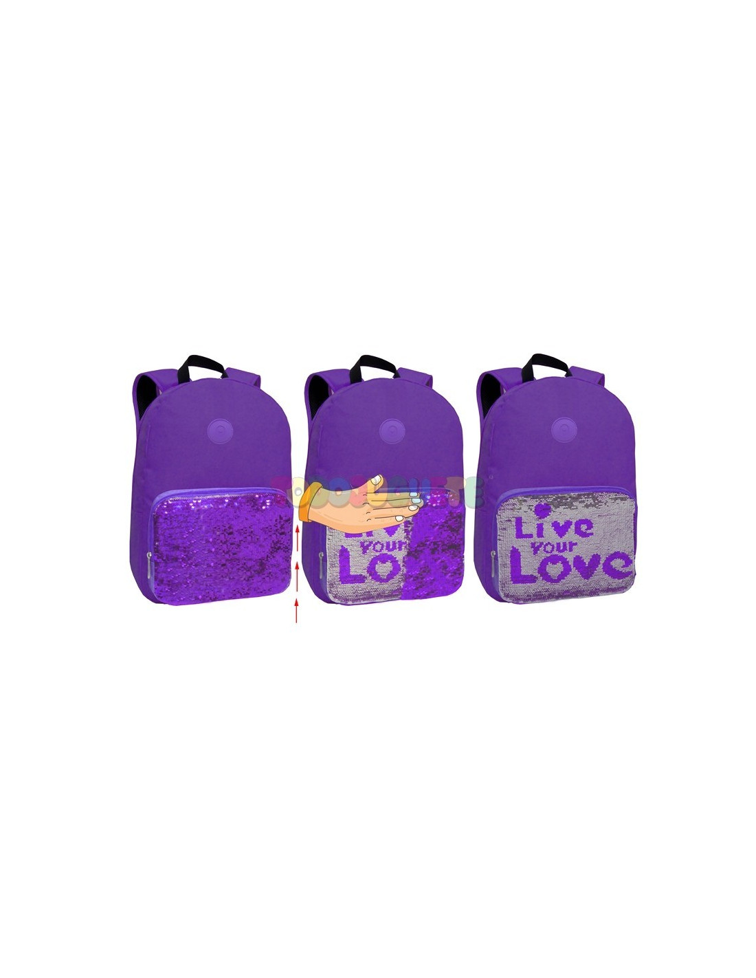 Mochila Ranking Life Violet medidas 33 x 42 x 14 cm. Con Bolsillo con lentejuelas reversibles y mensaje secreto al deslizar la mano sobre las lentejuelas