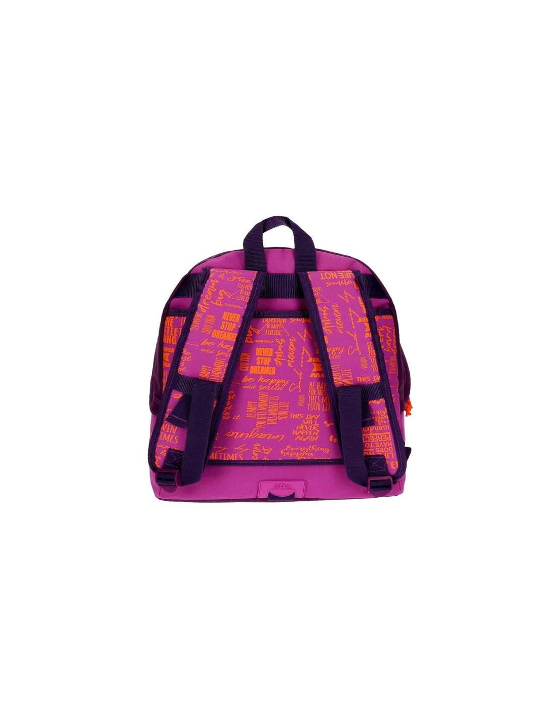Bonita mochila Smile en color violeta adaptable a carro. Mide 42 cm de altura. Cuenta con dos compartimentos uno grande y otro pequeño. Con frase aspiracional.