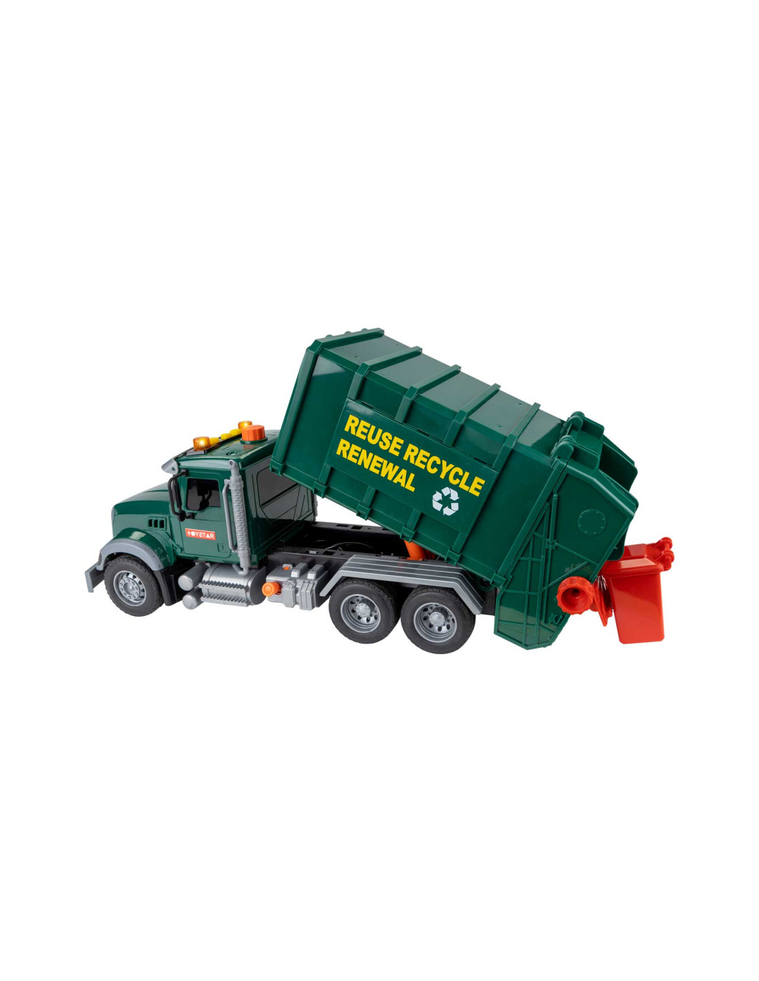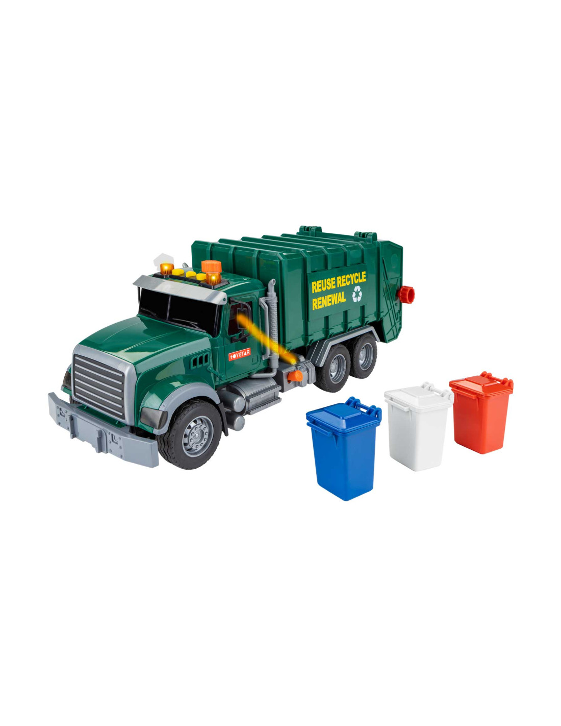 ¡Limpia toda la ciudad! Con este camión de reciclaje de juguete tu peque podrá crear mil historias y jugar sin parar. Función a fricción. Cuenta con bomba de aire. Podrás realizar muchas funciones para que el juego sea más realista, además cuenta con los 3 cubos de basura para que aprenda a reciclar y el valor de cuidar el medio ambiente. Edad recomendada: + 3 años. No recomendable para menores de 3 años, ya que contiene piezas pequeñas que podrían provocar asfixia en caso de ser ingeridas por el niño/a.