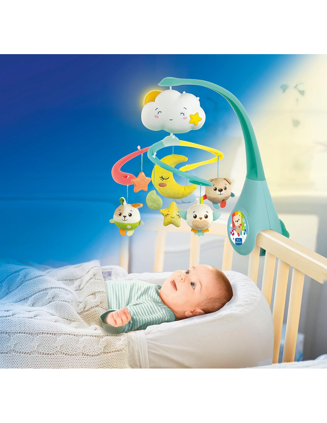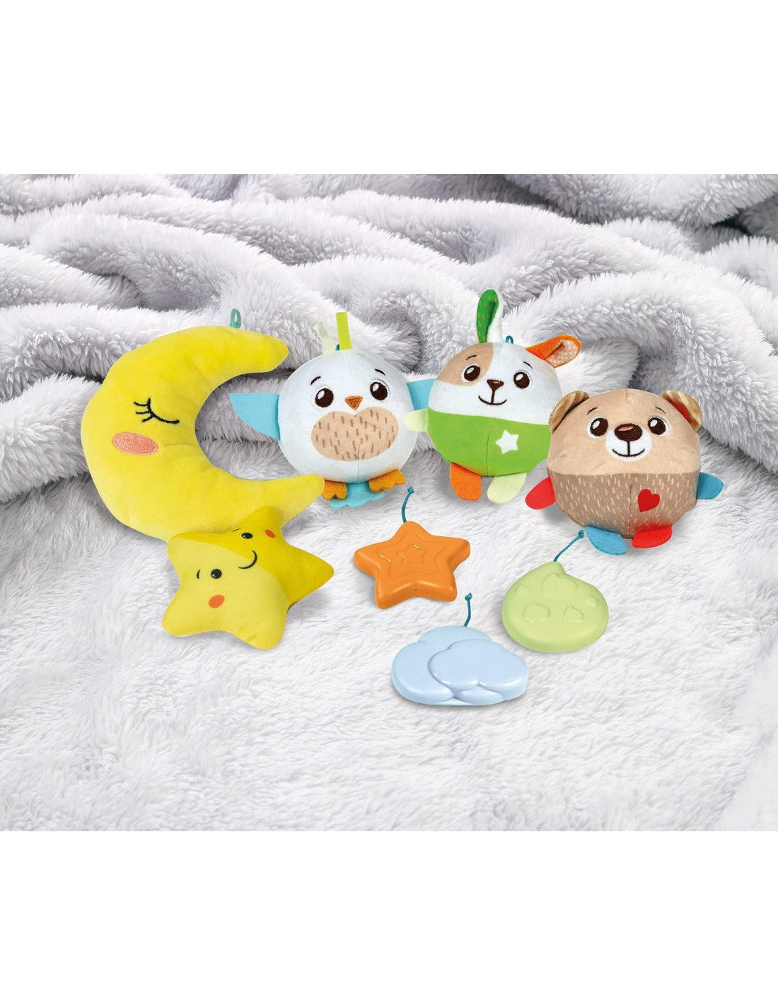 La suave y lenta rotación de los personajes, hechos en tela suave, llama la atención del bebé; y favorece su desarrollo visual, a la vez que lo acompaña suavemente hacia el sueño.