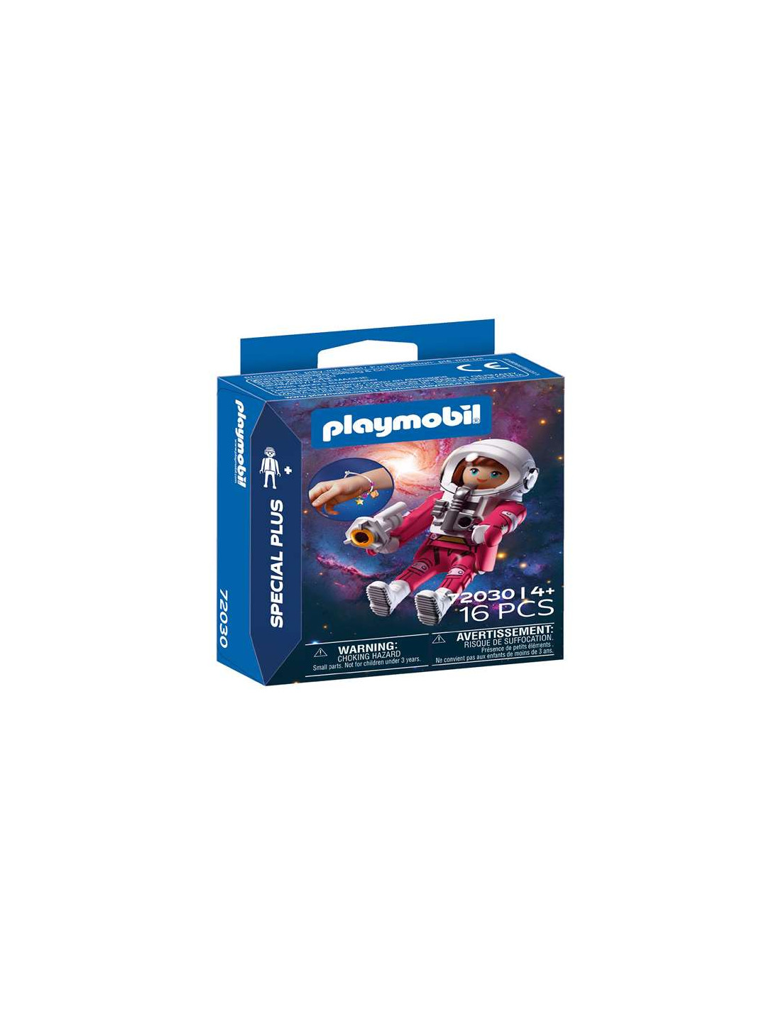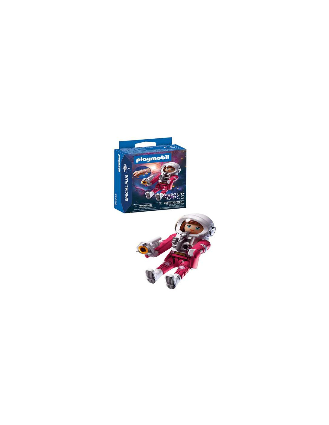 Muñeco articulado de PLAYMOBIL que representa a una mujer astronauta. Incluye un traje espacial y una pistola estelar. Posee una pulsera que brilla en la oscuridad. Diseñado para fomentar la imaginación y el desarrollo del lenguaje. Modelo: 72030
