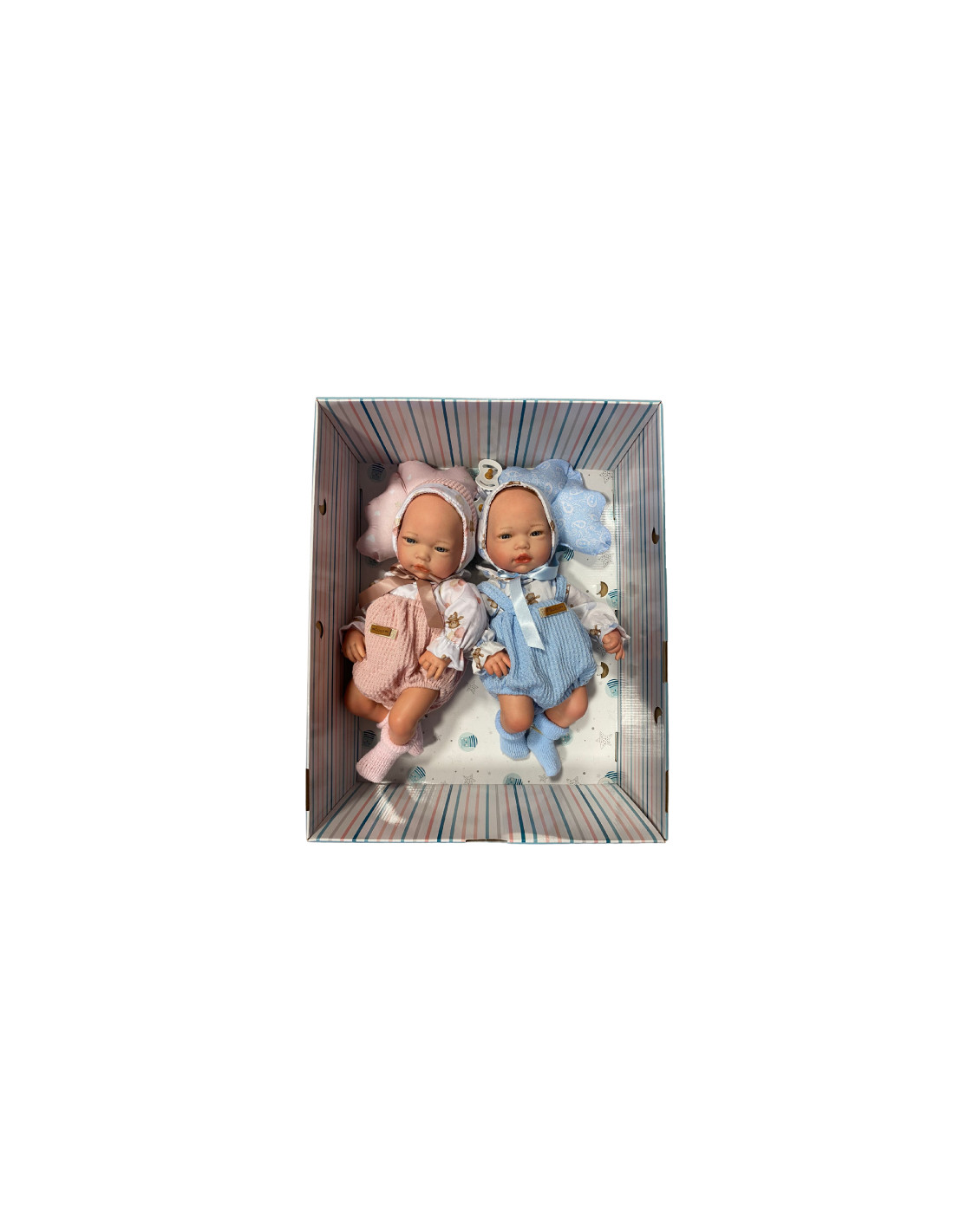 Muñecas GucaReborn parejita lola y joaquín, pelele rosa y azul de lana con camisa de corazones. Capota y calcetines. Están pintados a mano. No tienen pelo. Cuerpo de tela y extremidades de goma de vinilo. Mide 38 cm. El peso aproximado es de 1,900kg. Fabricadas en España. Tienen como complemento una nube porta chupete. Incluye 1 pañal cada muñeco. La caja contiene 1 certificado de autenticidad,1 cartilla de nacimiento y un pequeño catálogo con muchos más modelos