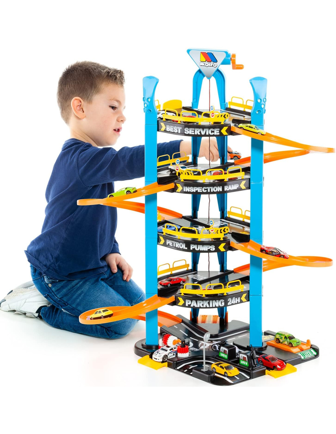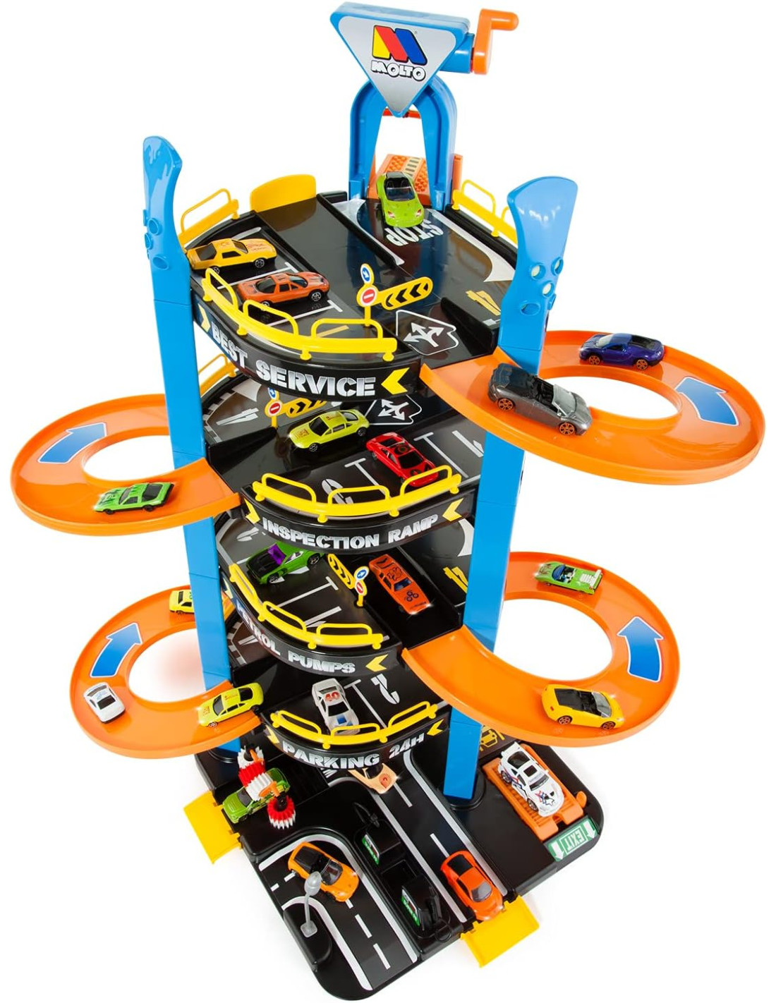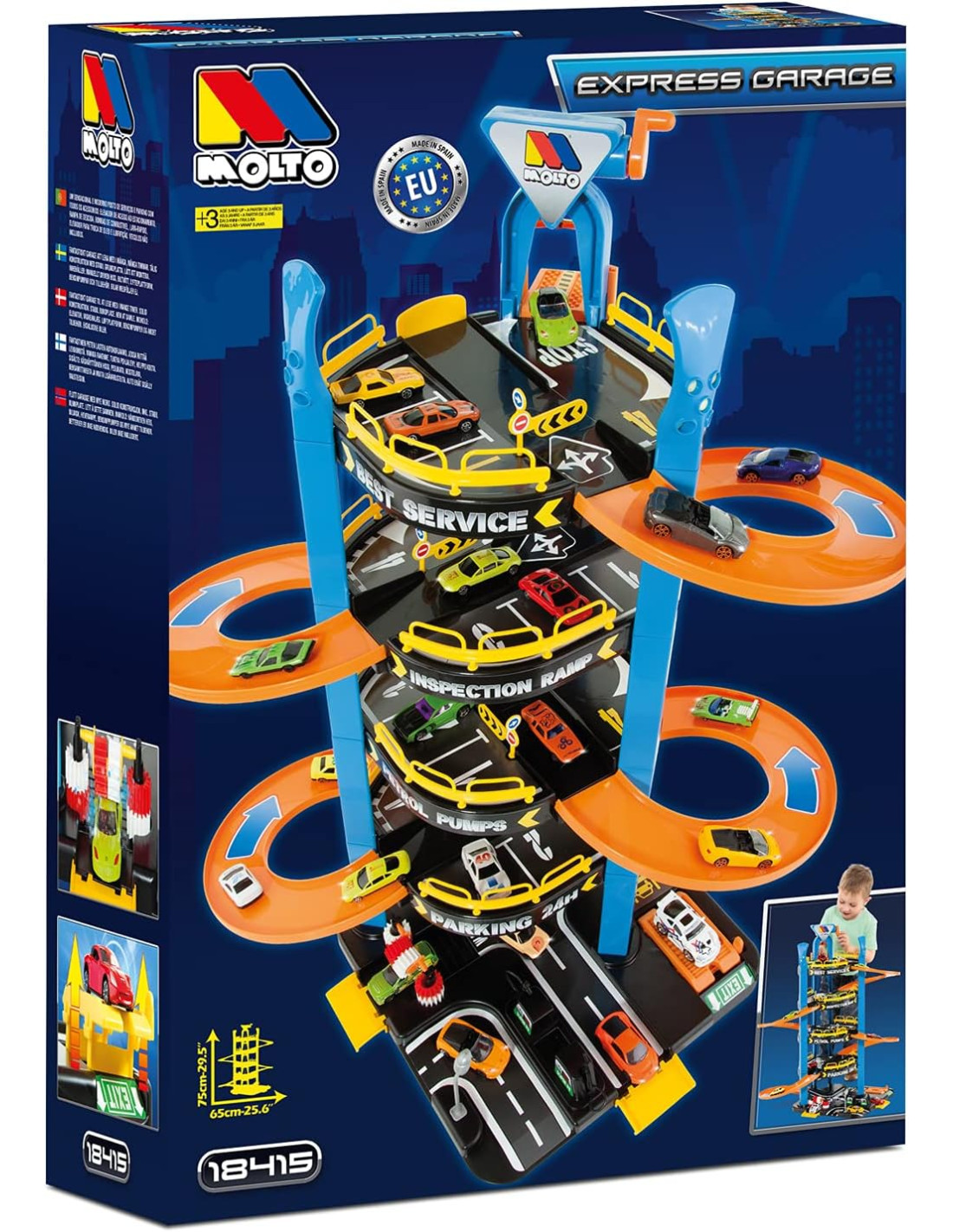 ????MOLTO Parking Infantil?!Gestiona tu propio parking con rampas, lavadero, ascensor, estación de servicio y zona de engrase!. Este parking de juguete tiene 5 plantas de altura con estacionamiento para multitud de coches. Con el parking infantil de Molto tendrás horas y horas de sana diversión alejada de las pantallas. Incluye un fabuloso helicóptero. (Este artículo viene sin coches incluidos)