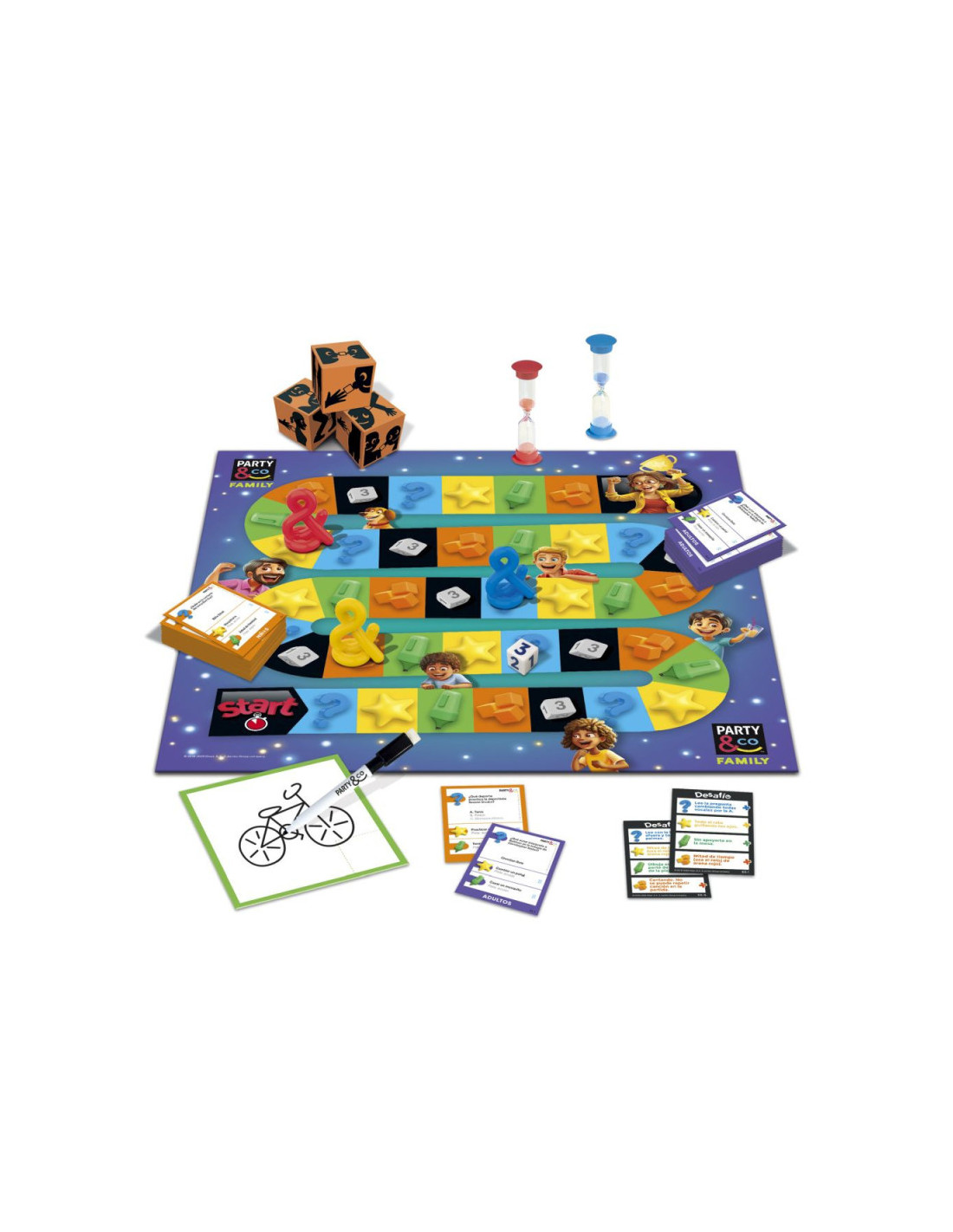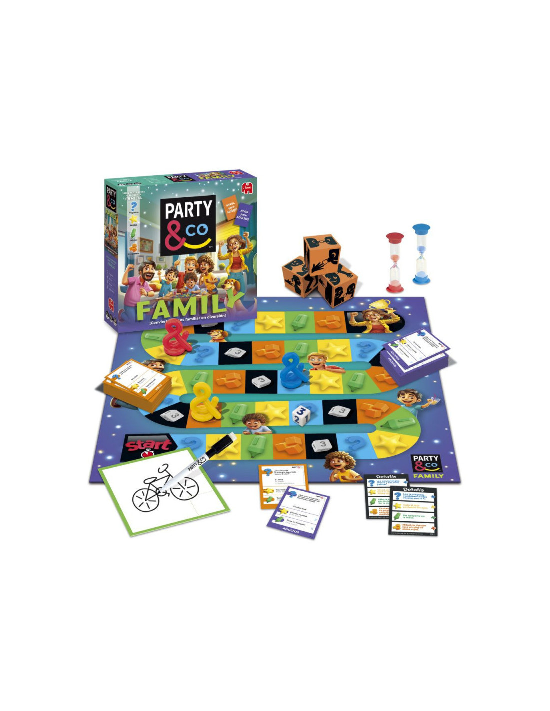 ¡Reúne a la familia con Party & Co.! Este juego de mesa presenta dos niveles de dificultad: uno para niños y otro para adultos. ¡Diversión para todos! Quien llegue primero al final del recorrido imitando, dibujando, haciendo poses, respondiendo a preguntas curiosas y afrontando divertidos retos, ganará la partida.