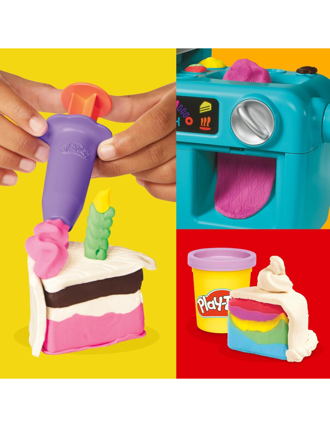 CREA COLORIDAS CAPAS: Crea una colorida variedad de pasteles Play-Doh de múltiples capas "midiendo" las bolas de mezcla para pastel con el molde tipo libro