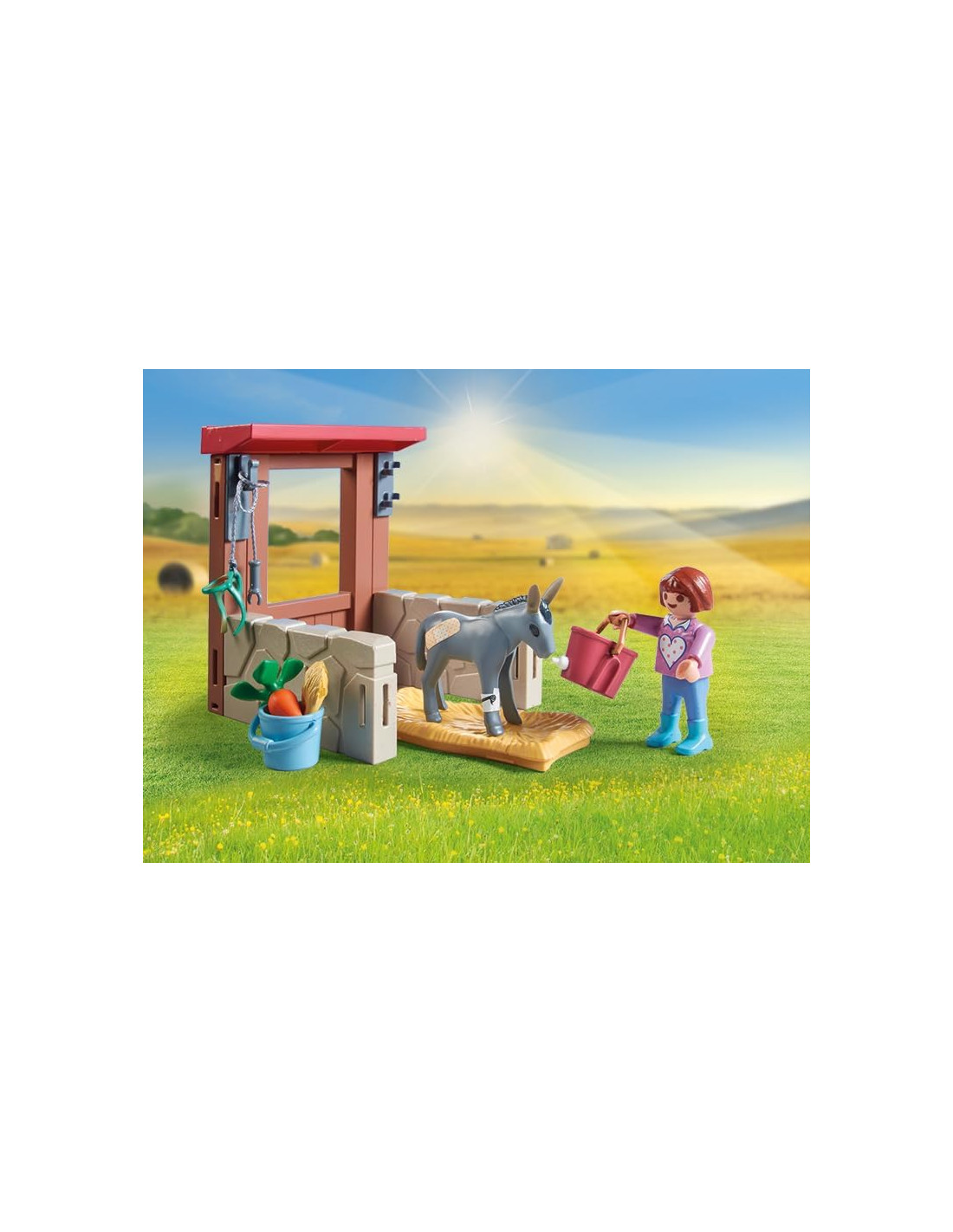 Ayuda al veterinario a cuidar de los burros con el Strter Pack de PLAYMOBIL Veterinaria de grana. La veterinaria examina con cuidado al burrito bajo la atenta mirada de la madre. Afortunadamente, el animal enfermo puede ser curado rápidamente. El siguiente en la lista es el pequeño hámster. La veterinaria siempre tiene mucho que hacer. Los fantásticos Starter PAcks de PLAYMOBIL invitan a los niños y niñas a sumergirse directamente en el variado mundo de PLAYMOBIL. Los sets incluyen figuras de juego y accesorios a juego de los mundos populares de PLAYMOBIL, se montan rápidamente y están inmediatamente listos para jugar. Además este set de juego está compuesto por más de un 80% de materiales sostenibles.