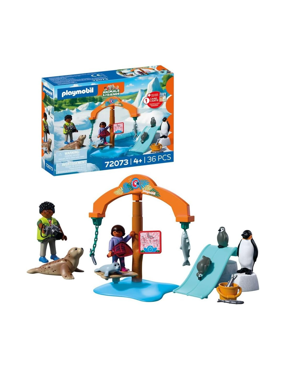 Completo set antártico con pingüinos y focas, donde un padre y su hija observan la animada vida de los animales en un entorno polar.
