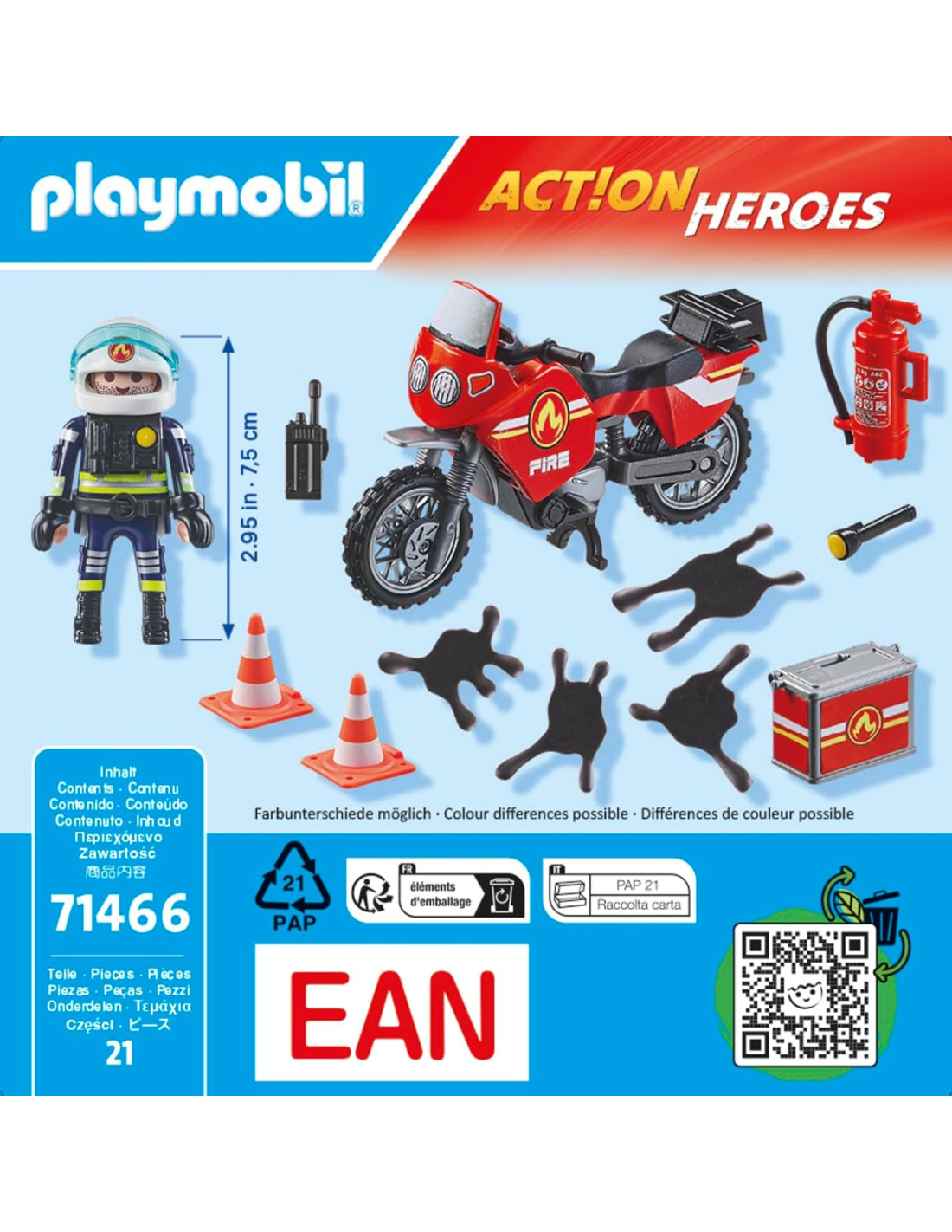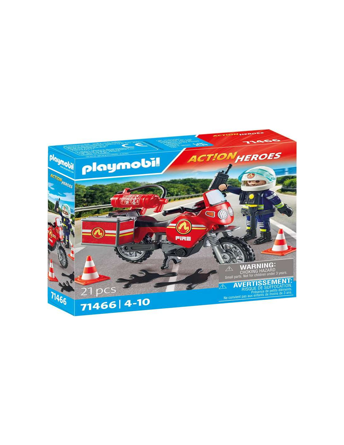 Con el fantástico set PLAYMOBIL ´Moto de bomberos´, ¡todos los niños y niñas se convierten en héroes del rescate! El bombero atraviesa los atascos de tráfico en su ágil motocicleta, asegurando la escena del accidente. El manillar y el caballete móviles proporcionan un juego realista, mientras que la figura se asienta firmemente en la moto. El extintor y la caja portaequipajes pueden fijarse en el lateral, detrás del asiento, y transportarse cuando están desmontados. Los guantes desmontables, el casco con visera móvil y el protectorpermiten un detallado juego de rol. Este set no sólo estimula la imaginación, sino que también mejora las habilidades motoras y el sentido de la responsabilidad: ¡el regalo perfecto para los aspirantes a socorristas a partir de 4 años!