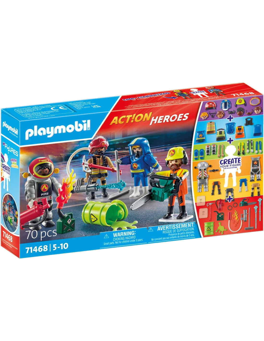 Descubre la diversidad con PLAYMOBIL MyFigures: ¡creativo, único y colorido! Este set presenta infinitas posibilidades de diseño con cuatro unidades especiales diferentes del cuerpo de bomberos. Las figuras vienen equipadas con cascos desmontables, protectores de brazos, trajes protectores y mucho más. Mezclando y combinando cabezas, cuerpos, brazos y piernas se consiguen creaciones siempre nuevas e imaginativas. Accesorios auténticos como un hacha de incendios, una motosierra, una manguera de incendios y un charco de silicona dan vida a cada misión. Dos placas base garantizan la estabilidad, mientras que el rociador de agua portátil y el cañón de fuego proporcionan diversión llena de acción. Un regalo ideal para los jóvenes entusiastas de la extinción de incendios a partir de 4 años.