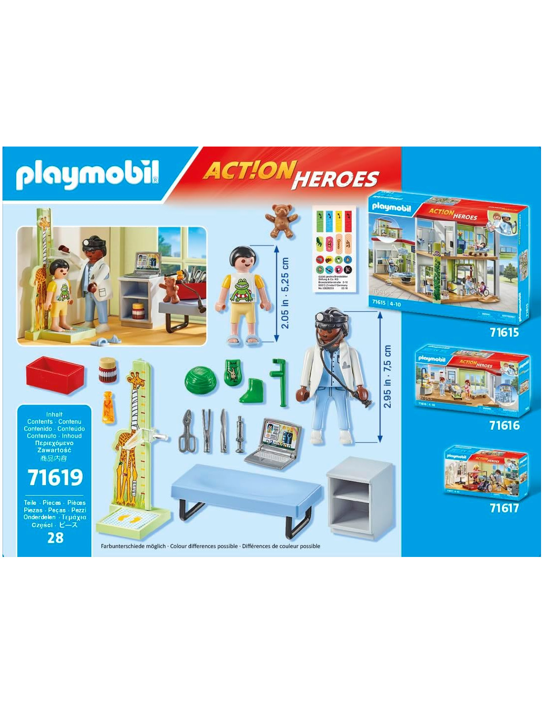 Tratamiento amoroso: El pediatra cuida tiernamente a sus pequeños pacientes. El osito de peluche proporciona confort y asegura que los niños se sientan a gusto. ¿Puedes ayudar al médico a hacer el diagnóstico correcto? Accesorios variados: Junto con una mesa de tratamiento, el set incluye una balanza de animales para medir la altura y varios vendajes y apósitos. ¡Se puede combinar con otros sets de hospitales Action Heroes para crear un mundo hospitalario completo!