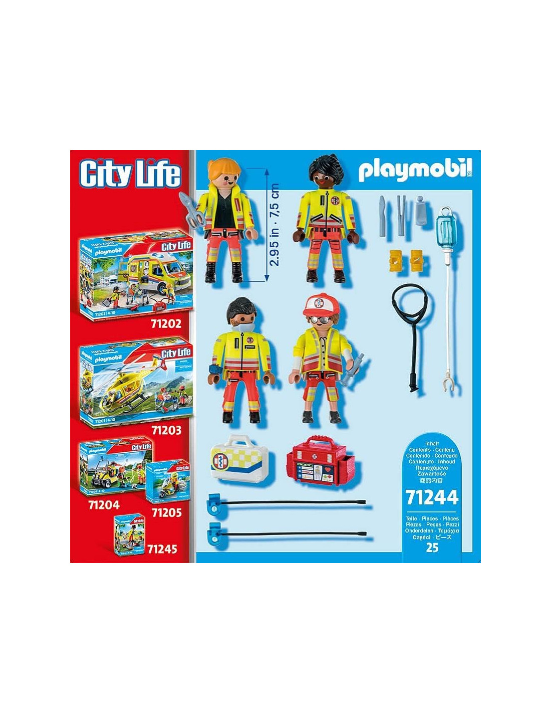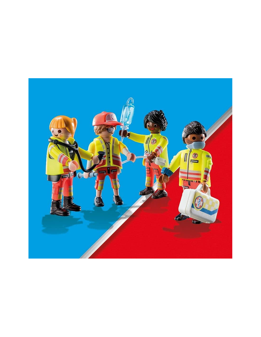 El valiente equipo de rescate está bien preparado para su próxima misión gracias al amplio equipamiento y a la bolsa de desfibrilación. Contenido: Figuras: 2 hombres, 2 mujeres; Accesorios: 1 suero, 1 estetoscopio, 1 instrumental de primeros auxilios, 2 férulas de vendaje, 1 botella de agua, 1 desfibrilador, 1 botiquín, 1 gorra, 1 reloj de pulsera