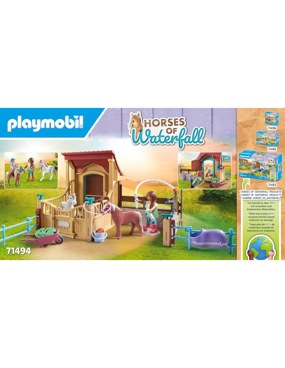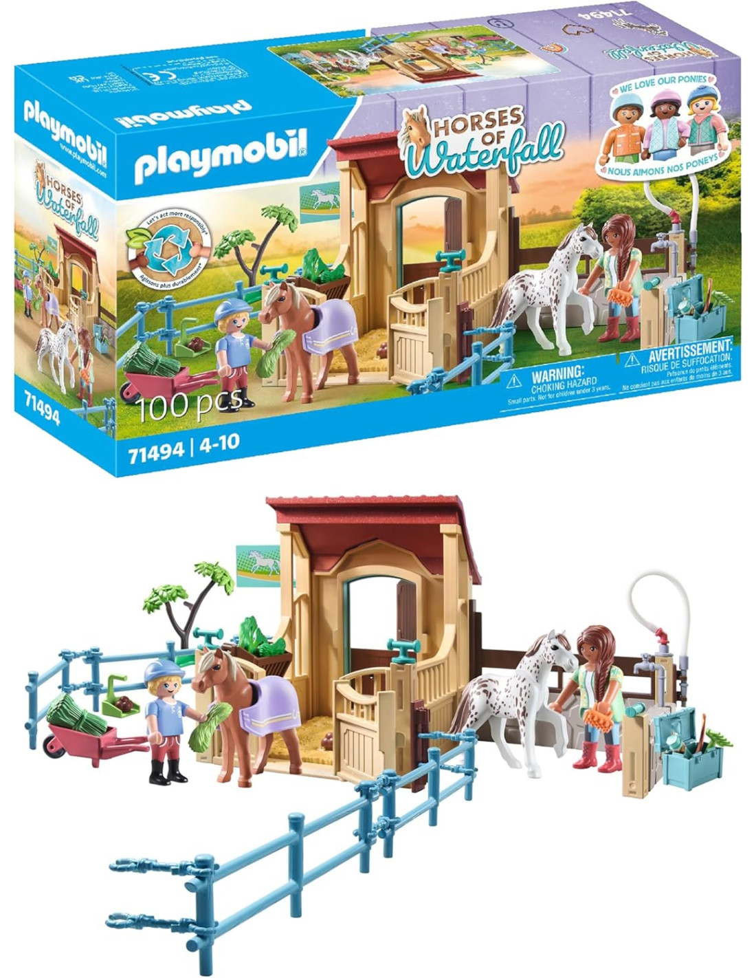 Bienvenidos al acogedor Establo del Rancho de Waterfall. Aquí, los ponis tienen mucho espacio para deambular en el amplio paddock y son cuidados con mucho amor y cariño. Para el cuidado diario de los caballos, hay un área de lavado y numerosos accesorios disponibles. Una vez que los caballos y ponis están limpios, pueden descansar y disfrutar de un montón de heno fresco. ¡Este establo es un sueño para cada poni! Especificaciones: - El set incluye un establo PLAYMOBIL con figura PLAYMOBIL, dos ponis, una caja para caballos con área de lavado, elementos de valla y numerosos extras para el cuidado de los caballos. - Viene con dos etiquetas en blanco para etiquetar la puerta del establo y la caja para ponis. - Un gran regalo para los aficionados a la equitación a partir de 4 años. - Horses of Waterfall de PLAYMOBIL está fabricado con más de un 80% de productos sostenibles.