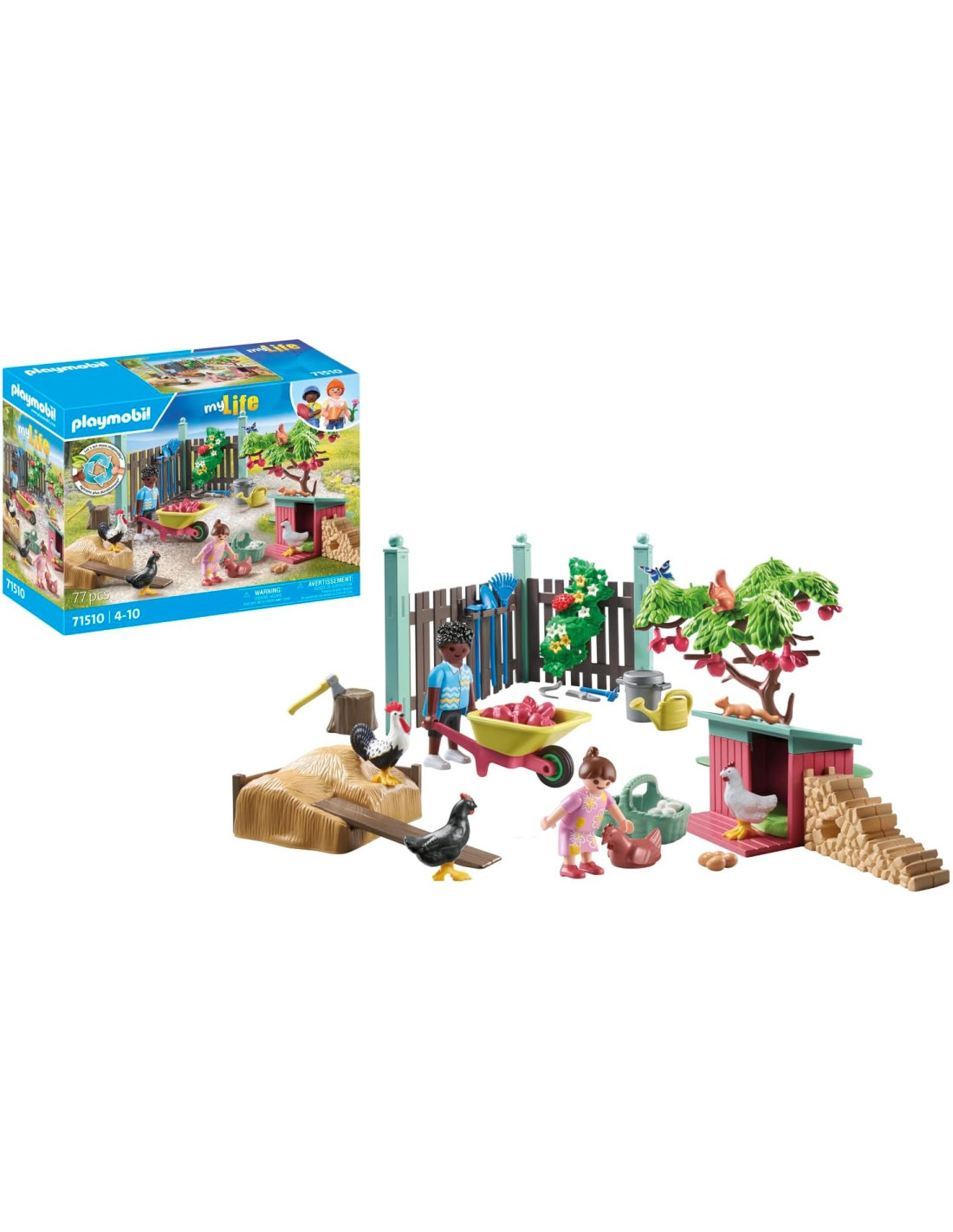 A los niños y niñas amantes de los animales les encantará la pequeña granja de pollos en el jardín del Tiny House de PLAYMOBIL. Hay mucho que hacer en este pequeño jardín: cuidar de los pollos, limpiar, cosechar manzanas, recoger huevos... Gracias a la pala, la azada, el rastrillo y la carretilla, el trabajo es fácil de manejar. El mundo de juego del Tiny House de PLAYMOBIL invita a niñas y niños a participar de manera lúdica en los temas de sostenibilidad y protección del medio ambiente. Especificaciones: - Detallado set de juguetes con dos figuras de PLAYMOBIL, un gallo y tres gallinas, una ardilla, un gallinero, un manzano y muchas herramientas de jardín para divertidas aventuras de juego de roles. - Las manzanas se pueden cosechar del árbol. - PLAYMOBIL Tiny House está fabricado con más de un 80% de productos sostenibles.